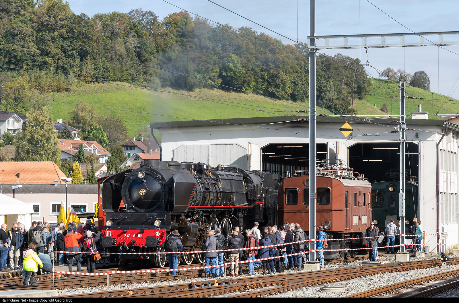 | The former french railway SNCF fourcylinder compound express train steamlocomotive 241 A # 65 of the association Dampflok-Depot Full (DDF) made a visit at the Huttwil steam days in the Emmental. After a journey from Sumiswald-Grünen to Huttwil, the large steamlocomotive is now standing in front of the shed to take water and coal. On the right is small former BLS electrolocomotive Te 2/3 # 31 and in the shed railcar BDe 2/4 # 240 of the VHE. |