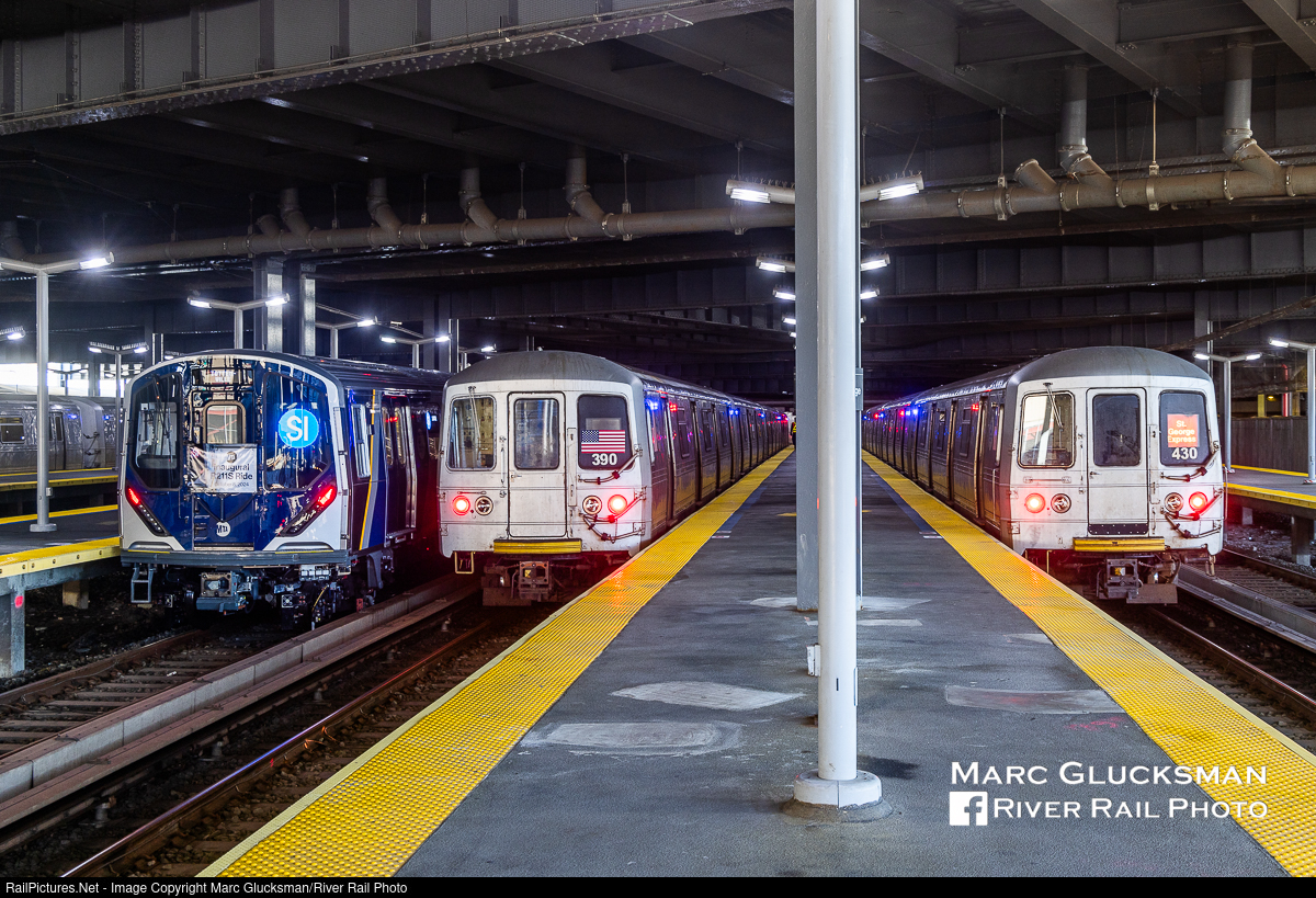 Staten Island Variety Show. The MTA Staten Island Railway operates on a 14 mile-long 21 station line in Staten Island, New York. The third class of cars built for this line, the Kawasaki R-211S, made its debut for the public on Tuesday, October 8, 2024 (N-SIR 100-101-102-103-104-S). This 75 car order of 5-car sets will be the replacement for the 1971-1973 St. Louis Car Company built R-44S/ME-2 fleet (originally 52 cars, later supplemented with 12 former MTA NYCT Subway R-44 cars). There are few differences between the R-211A cars operating on the "A Line" and these R-211S cars, the main one is that the R-211S cars have ATC (track-circuit-based automatic train control) and the R-211A have CBTC (communications-based train control). There is currently a second 5-car set on the property, cars SIR 105-109, with more cars planned to arrive soon. A lucky "group shot" presented itself at the St. George terminal with R-211S 104, R-44S 388 (ex-NYCT Subway) and R-44S 430 sitting next to each other that morning.