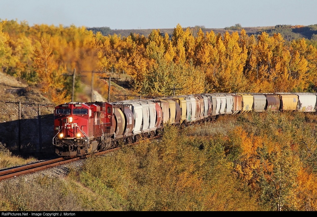 CP 8951 leads a loaded grain train west between Glenbow Ranch and Cochrane on a lovely fall evening.