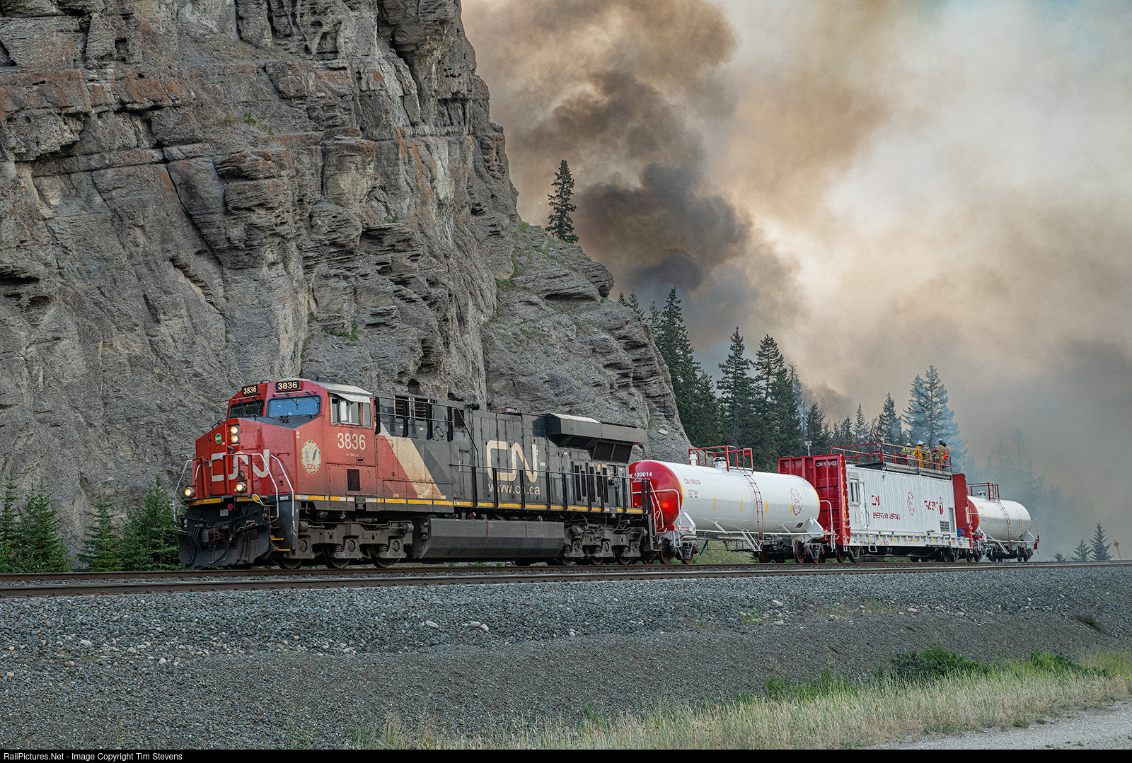 Firefighting train W910 prepares to shove into the wildfire east of Jasper.