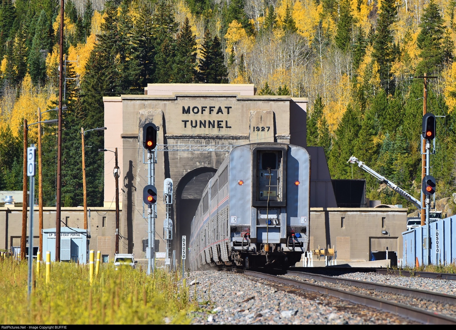The California Zephyr seemingly dives into the east portal of the Moffat Tunnel as the Tolland valley glistens gold with fall aspen colors.