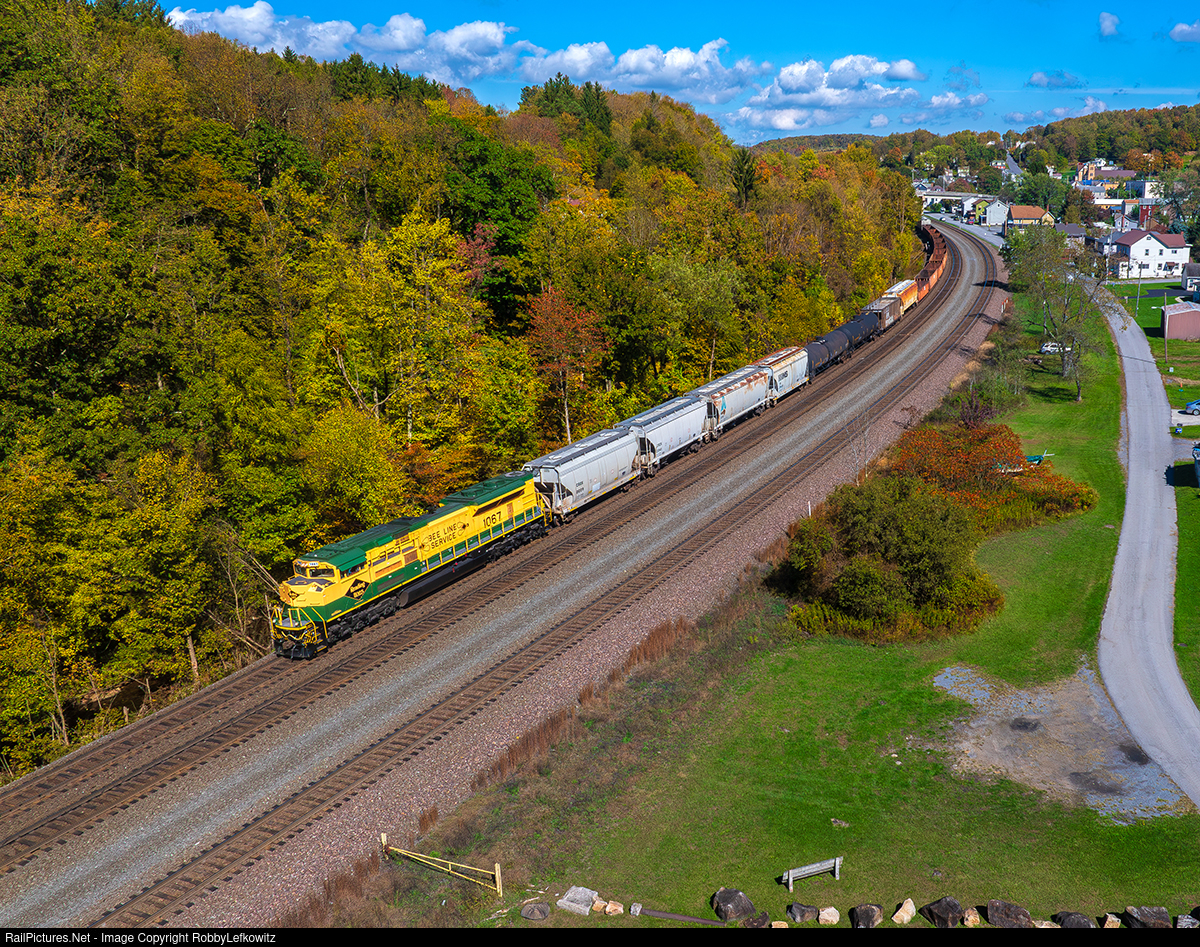 Lilly Leafers: As the leaves begin to show fall colors, NS 1067, the fresh Reading Heritage Unit, leads westbound manifest NS 11V through Lilly, Pennsylvania, along the NS Pittsburgh Line.