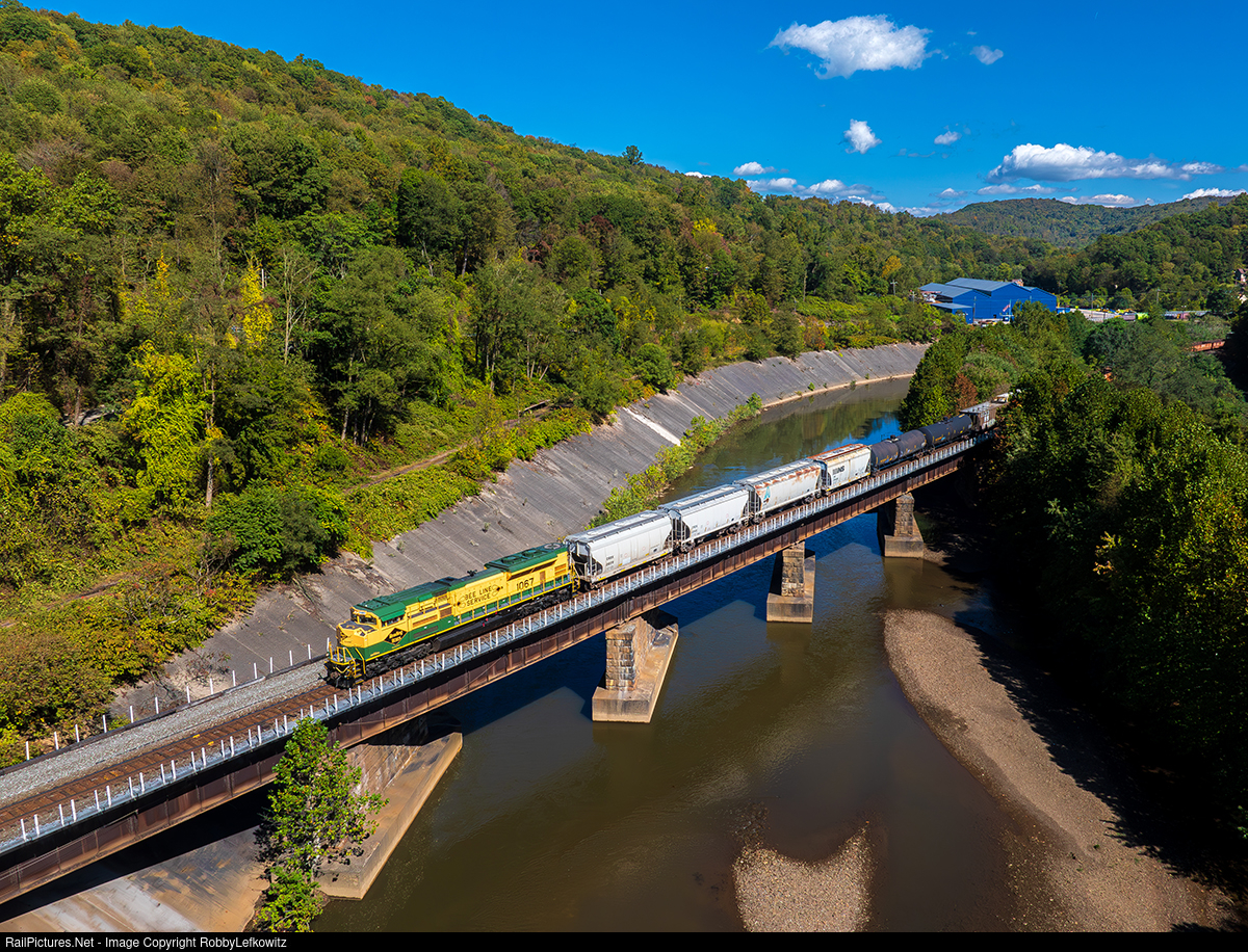 AS NS 11V, led by the fresh NS 1067 Reading Heritage Unit, begins its climb up toward Conpit, the train is seen crossing the Conemaugh River as it enters the Sanghollow extension, where track three runs on the other side of the river toward Conpit, Pennsylvania.