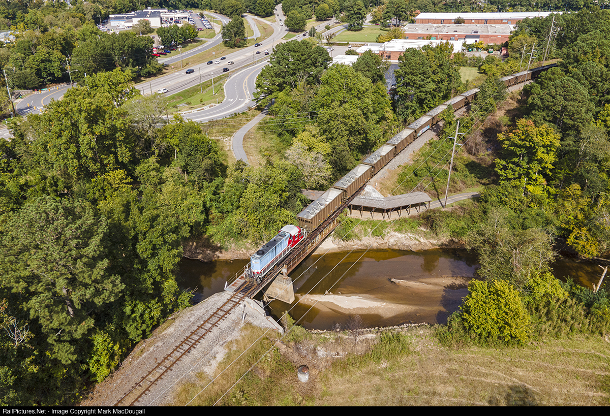 A Carolina Coastal empty coal train crosses Crabtree Creek with a single GP9 for power. The cars are being removed from storage on the former NS main.