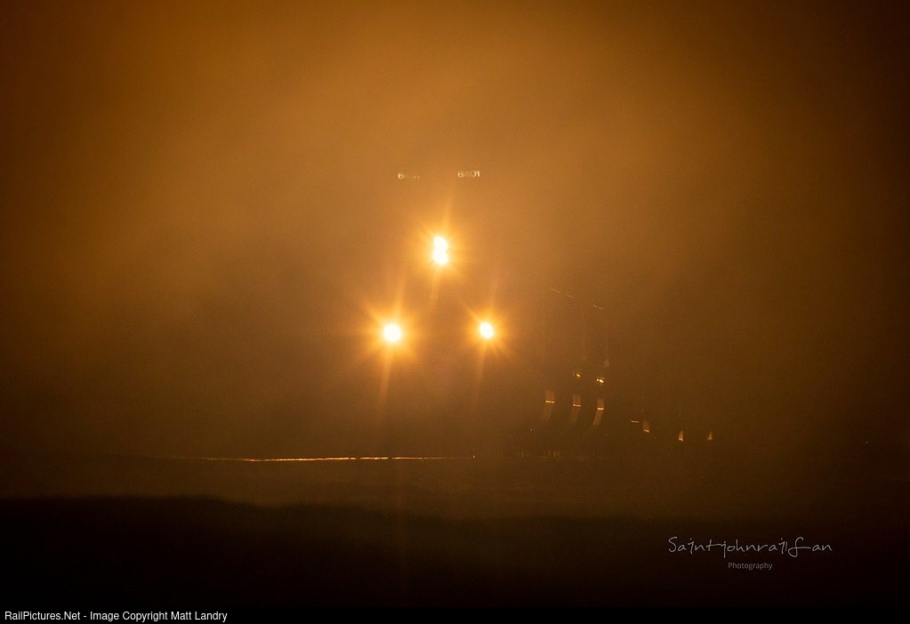 On a foggy, cool morning before sunrise, NBSR 6401 sits near the non-visible railway station in McAdam, New Brunswick. The crew is doing some switching before heading eastward to Saint John, New Brunswick.