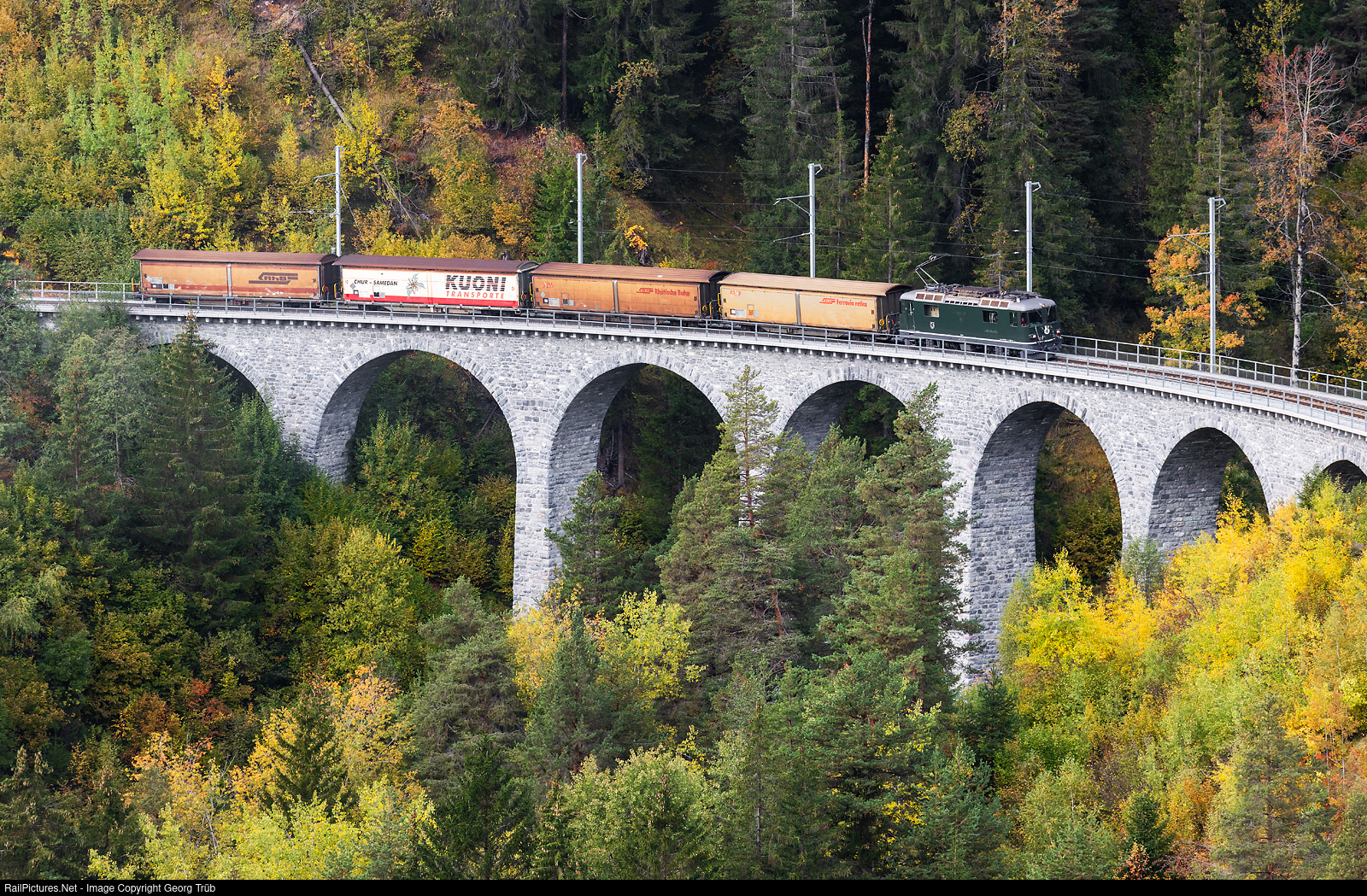 | Ge 4/4 II # 611 of the Rhaetian Railway, first of the series built in 1973, in the green color again like it was delivered, pulls the freight train 5129 from Chur freight yard to Samedan, over the 35 meter high and 137 meter long Schmittentobel viaduct between Alvaneu and Filisur. |