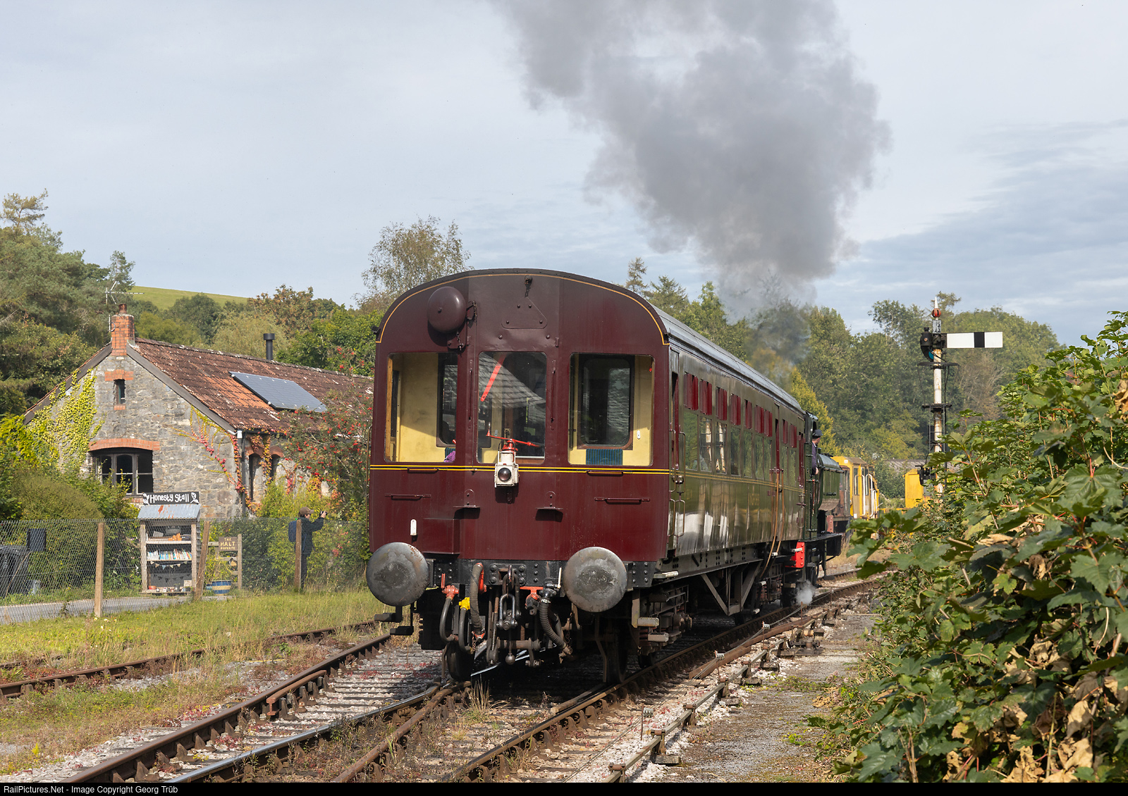 This is a steam powered push-pull train, in Great Britain called "autotrain", with former British Rail cab car # 233 "Kingfisher" in the rear and 0-6-0 PT tank steamlocomotive # 6412 pulling. leaving Staverton on the South Devon Railway for Totnes Riverside, during the heritage open days. The car was renovated till last year and is in a nice marron paint now. In the "autocoach" service a locomotive fitted with additional control equipment is used to power the autotrain. When running 'autocoach first', the regulator is operated by a linkage to a rotating shaft running the length of the locomotive, passing below the cab floor. This engages (via a telescopic coupling) with another shaft running the full length below the floor of the autocoach. This shaft is turned by a second regulator lever in the cab of the autocoach. The driver can operate the regulator, brakes and whistle from the cab at the end of the autocoach; the fireman remains on the locomotive and (in addition to firing) also controls the valve gear settings. The driver can also warn of the train's approach using a large mechanical gong, prominently mounted high on the cab end of the autocoach, which is operated by stamping on a pedal on the floor of the cab. The driver, guard and fireman communicate with each other by an electric bell system.
