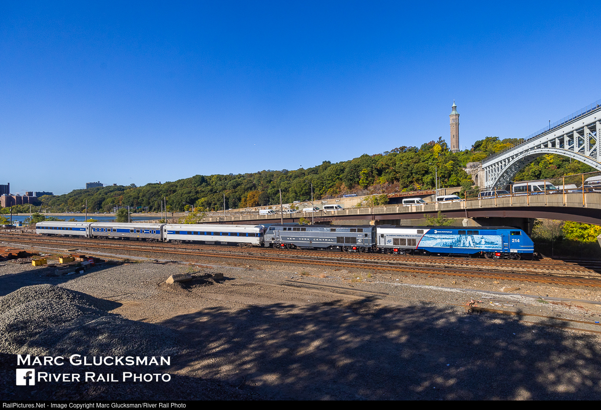 MTA Metro-North Inspection Train On The Hudson Line. On Thursday, October 10, 2024, MTA Metro-North operated an Inspection Train on the Hudson Line with MNCW 214 (40th Ann/Employee Appreciation) facing north/west and MNCW 211 (40th Ann/New York Central) with its 3 Office Cars. The cars are in fact old, one former New York Central and the other two former Lackawanna Railroad. The locomotives are contemporary models, but "wrapped" in the paint scheme of predecessor railroads. The train headed up the he train headed up the Hudson Line to Poughkeepsie, where the locomotives ran around the cars for the return trip to Grand Central Terminal, giving railroad executives and management the opportunity to inspect many ongoing, completed, and needed improvements on the line. The rear view of the Inspection Train shows the rear facing windows of the former Lackawanna Phoebe Snow observation car. The Employee Appreciation unit is seen facing north/west passing under the High Bridge, a vintage New York City landmark that was constructed in 1848.