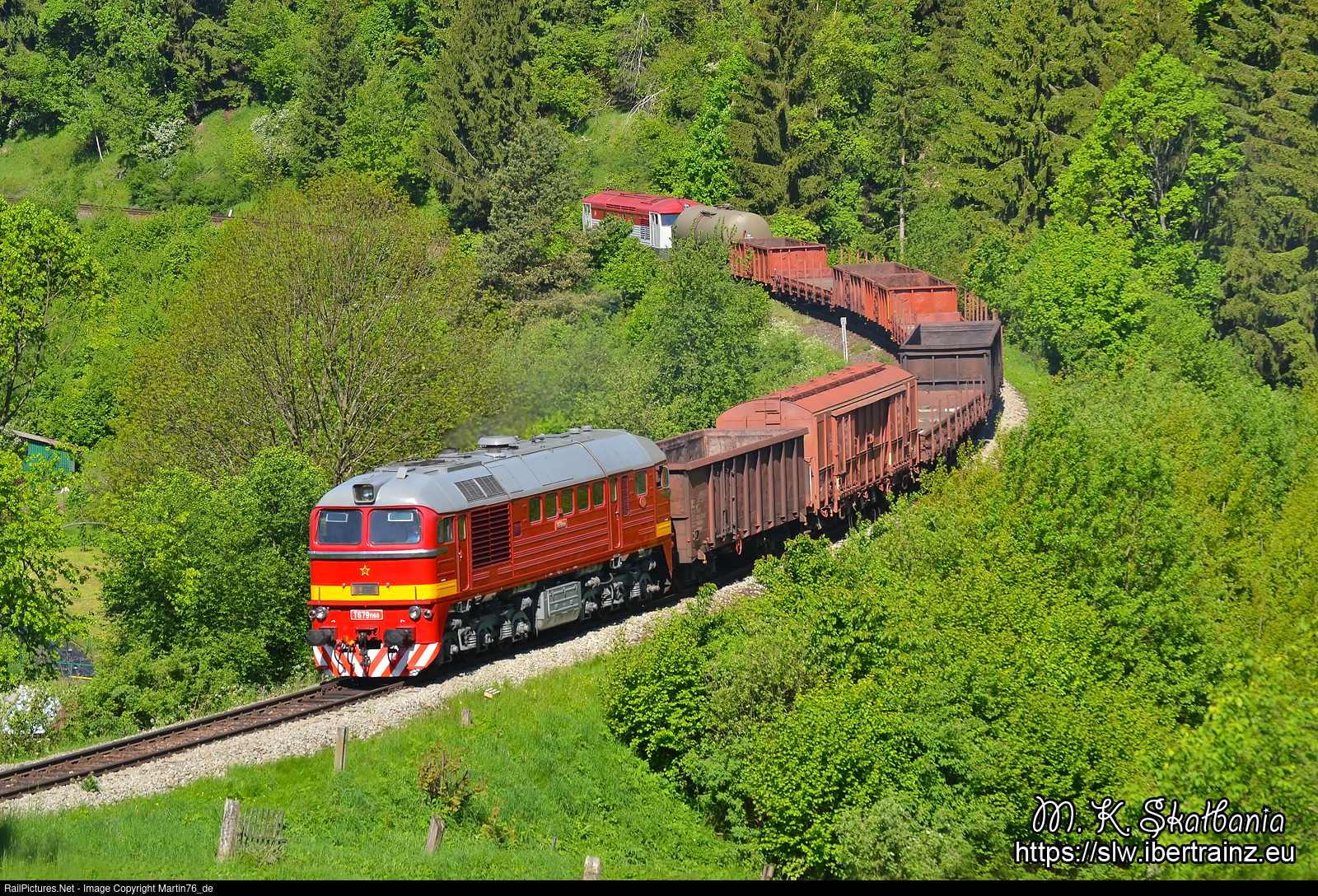 | A special freight train (also a fire train) hauled by the T 679.1168 locomotive, is approaching the village of Turcek. |