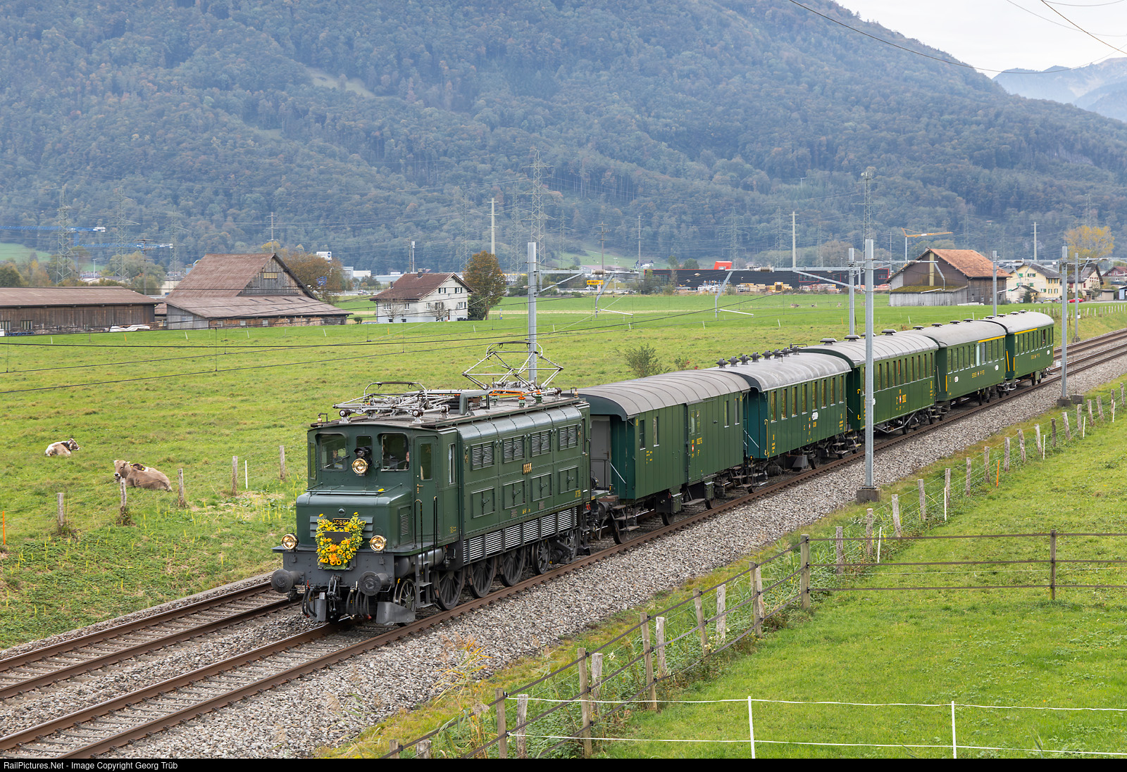 SBB Historic Ostschweiz in Rapperswil organized an autumn trip to Linthal with the electric locomotive Ae 3/6 I # 10664 with Buchli drive, built in 1926. The train is now also on the return trip from Linthal via Schwanden-Ziegelbrücke-Pfäffikon SZ to Rapperswil, between Bilten and Reichenburg. In the train are the three-axle baggage coach F3 # 18275 (built in 1907), the two-axle third class passenger coach C 6138 (1916), the four-axle third class coach C4 # 9002 (1909) from SBB Historic, as well as the two former SBB 1st/2nd class coaches AB # 4126 and # 4212 from Railvetica.