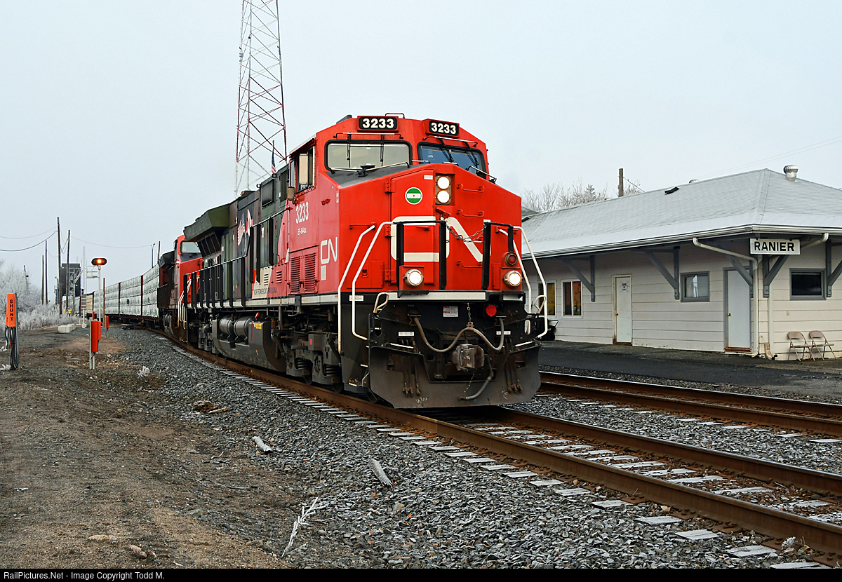 | CN 3233, Salute to Veterans, comes across the Canadian border with mixed freight for the U.S. passing by the former DW&P depot as they enter the country. |