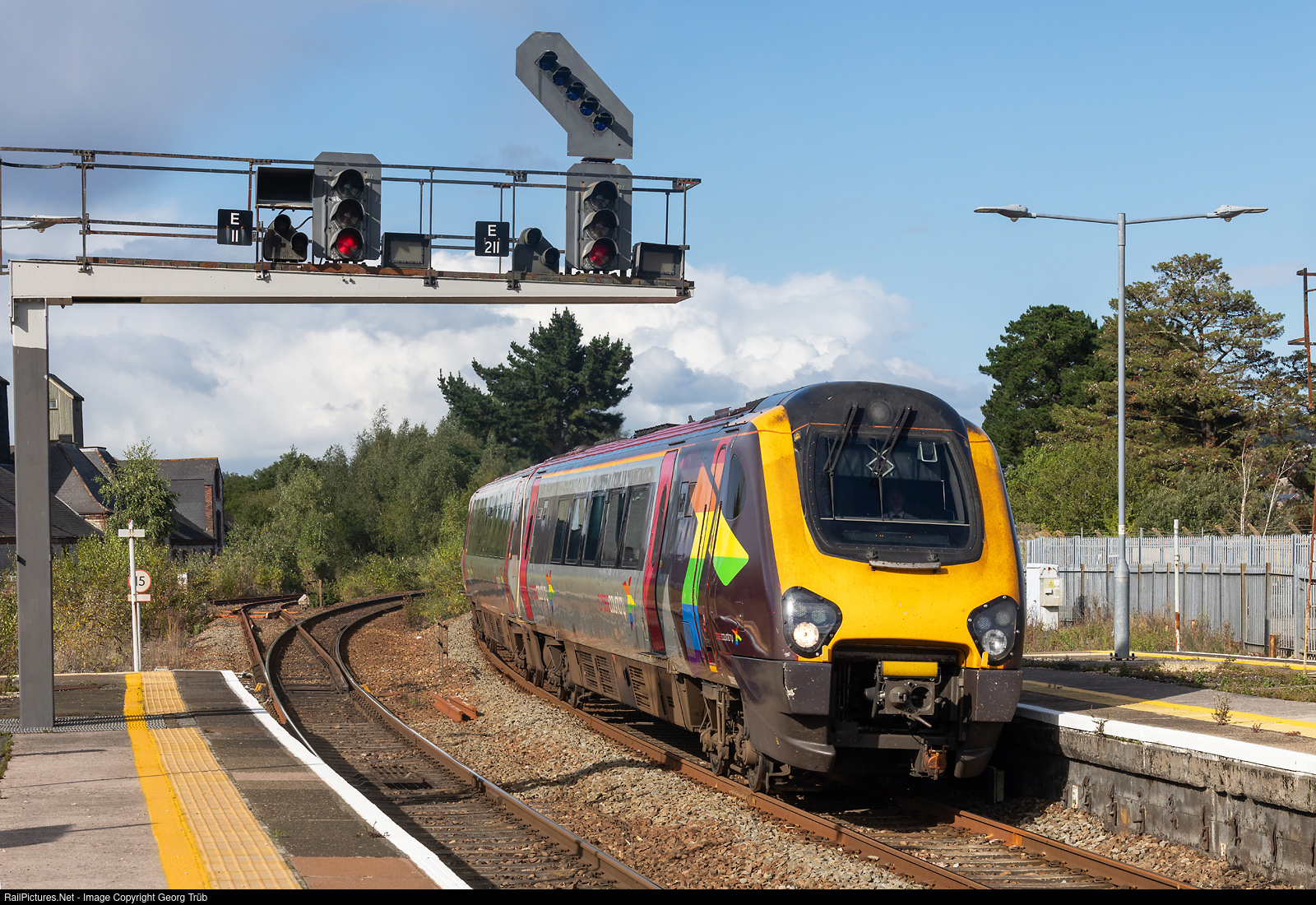 | 4-car diesel train "Voyager" 220 # 005 of the Cross Country is entering Newton Abbot, running as 1V54 from Edinburgh (dep. 08.10) to Plymouth (arr. 16.47). |