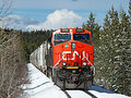 Positioned on the tailend, CN ET44AC 3095 remotely assists A459's 148 cars down the steep hill towards Swan Landing.