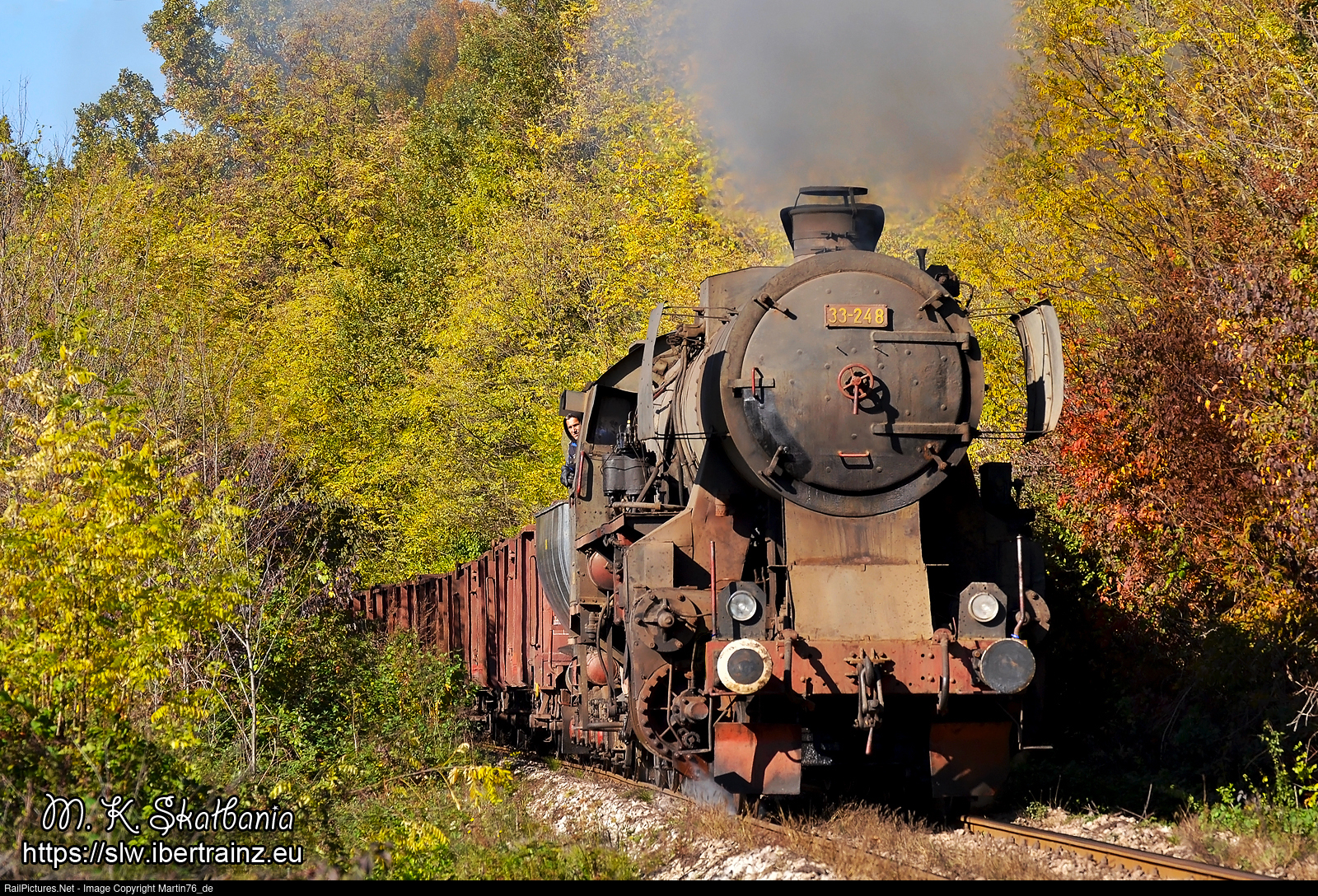 | The steam locomotive 33-248 hauling a freight train from coal mine "Sikulje" in Lukavac to Zivnice passes through a forest covered in autumn colors, leading the train to the final station. |