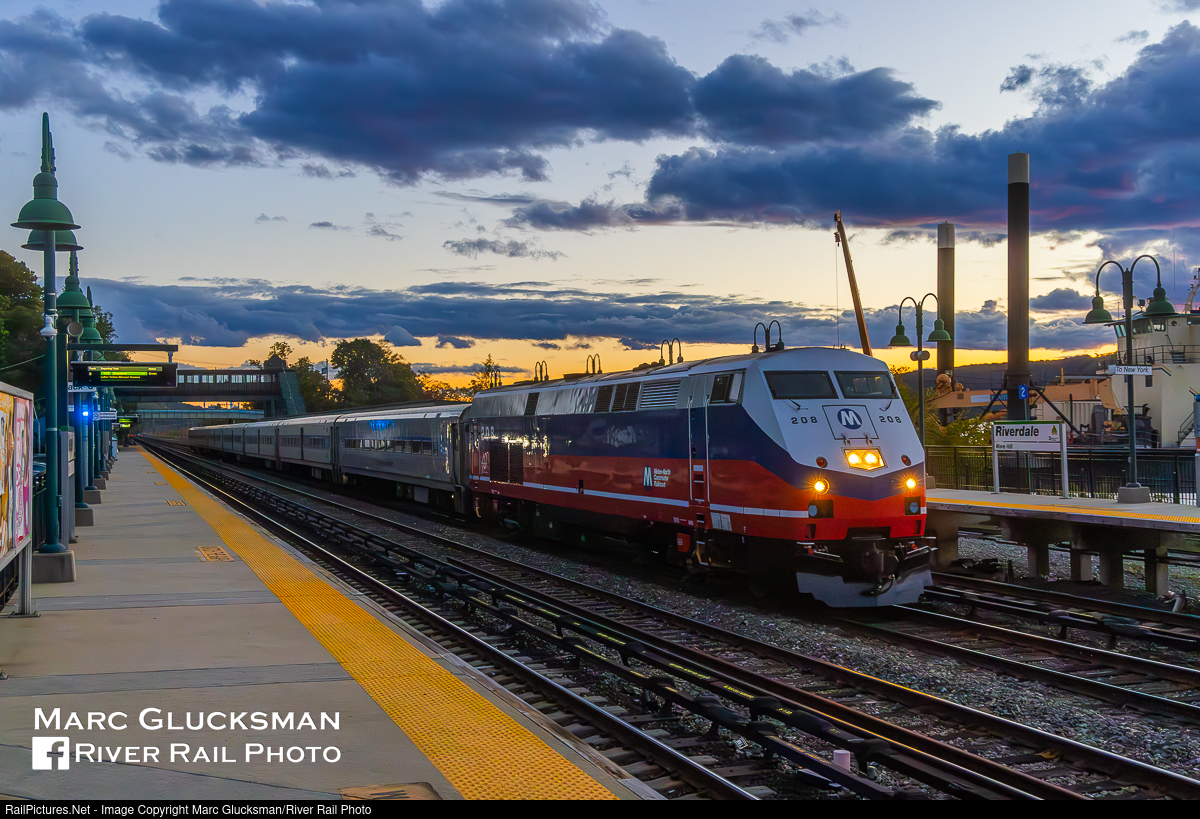 Beachball At Sunset. MTA Metro-North Railroad MNCW 208 (P32AC-DM, Beachball Paint Scheme, 40th Anniversary) led Train 857 through the Riverdale Station in the Bronx, New York at sunset on the evening of Tuesday, October 15, 2024. This unit was the first of the 40th Anniversary "heritage wraps" and recently had some changes made to the nose colors before being on display at the Croton Open House Event.