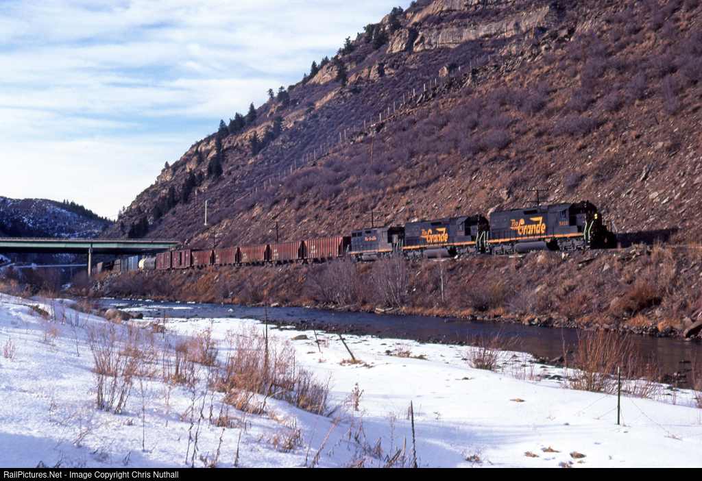 5413, 5412 and 3039 slip under the I70, as they follow the Eagle River into Minturn, with #36 eastbound freight. The first and last locomotives, I believe, are still with us today, 5413 with the Wheeling and Lake Eire and possibly even in the same coat of paint, and 3039 with the MRL as MRL403.