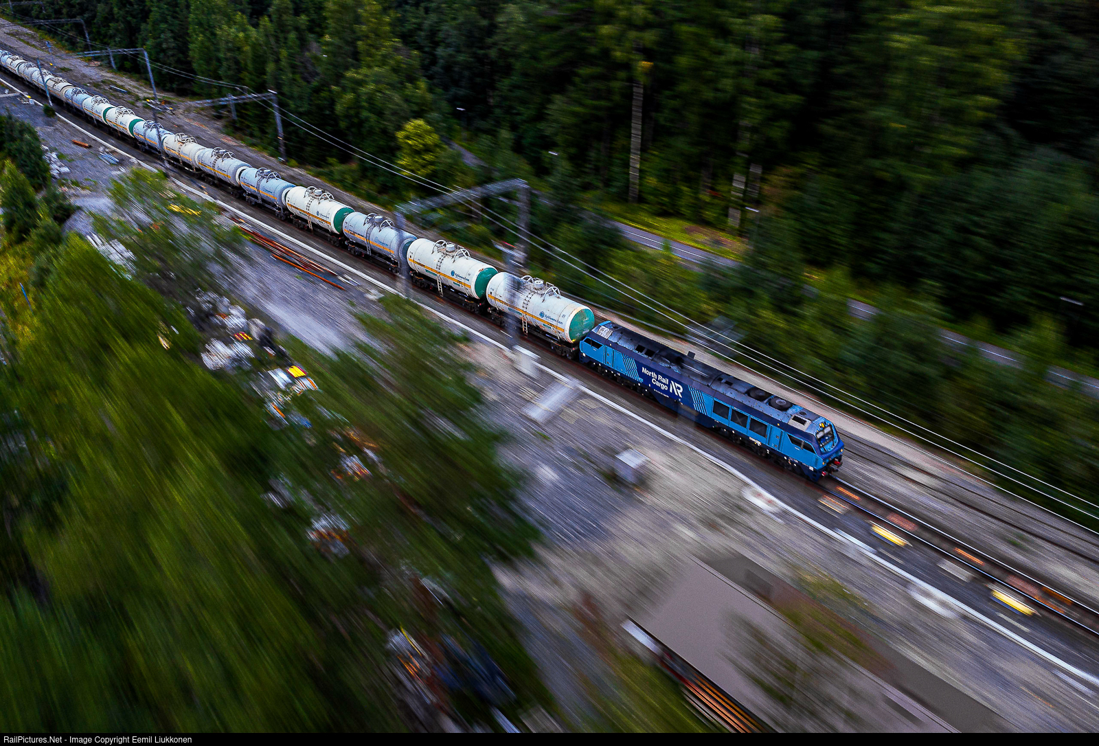 | An empty tanker train from Siilinjärvi is pulled by GE powerhaul locomotive while the new North Rail Oy colour scheme shine in the side of the big diesel locomotive while it rushes to Kouvola. |