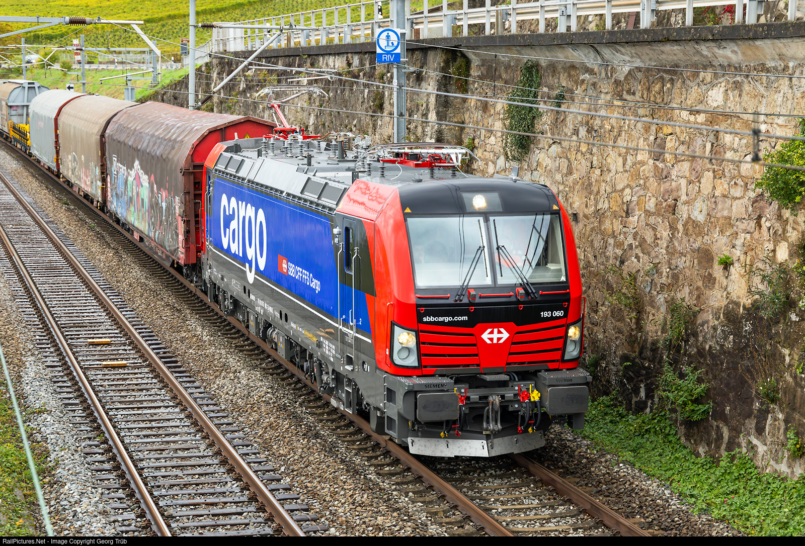 | SBB Cargo leases 35 Siemens “Vectron” locomotives for 8 years from 2024 via the lessor NorthRail and financed by Bank Reichmuth in Lucerne. The first machines have now been in Switzerland for a few weeks and training of locomotive crews has begun at some locations. Scheduled freight trains are being hauled. 193 # 060 pulls freight train 61073 from Lausanne shunting yard to Sion between Rivaz and St-Saphorin. The locomotive for 15000 V 16.7 Hz AC weighs 86 tons, has an output of 6400 kW and is licensed in Switzerland, Germany and Austria. There are two pantographs visible on the roof. In front (lowered) with wider contact bar for Germany and Austria, in the rear for Switzerland with shorter contact bar.