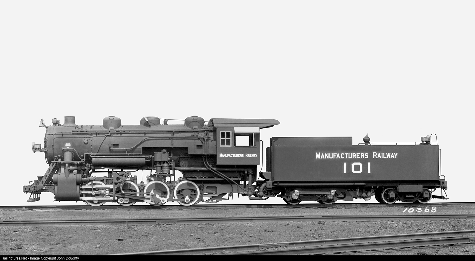 Manufacturers Railway Company 0-8-0 number 101 had a total engine and tender weight of 410,300 lbs., and a tractive force of 58,300 lbs. It was built by the Baldwin Locomotive Works, where my great, great uncle, Robert F. McKee, Sr., was a design engineer. This Baldwin Locomotive Works builders photo card is from the John R. Doughty collection.