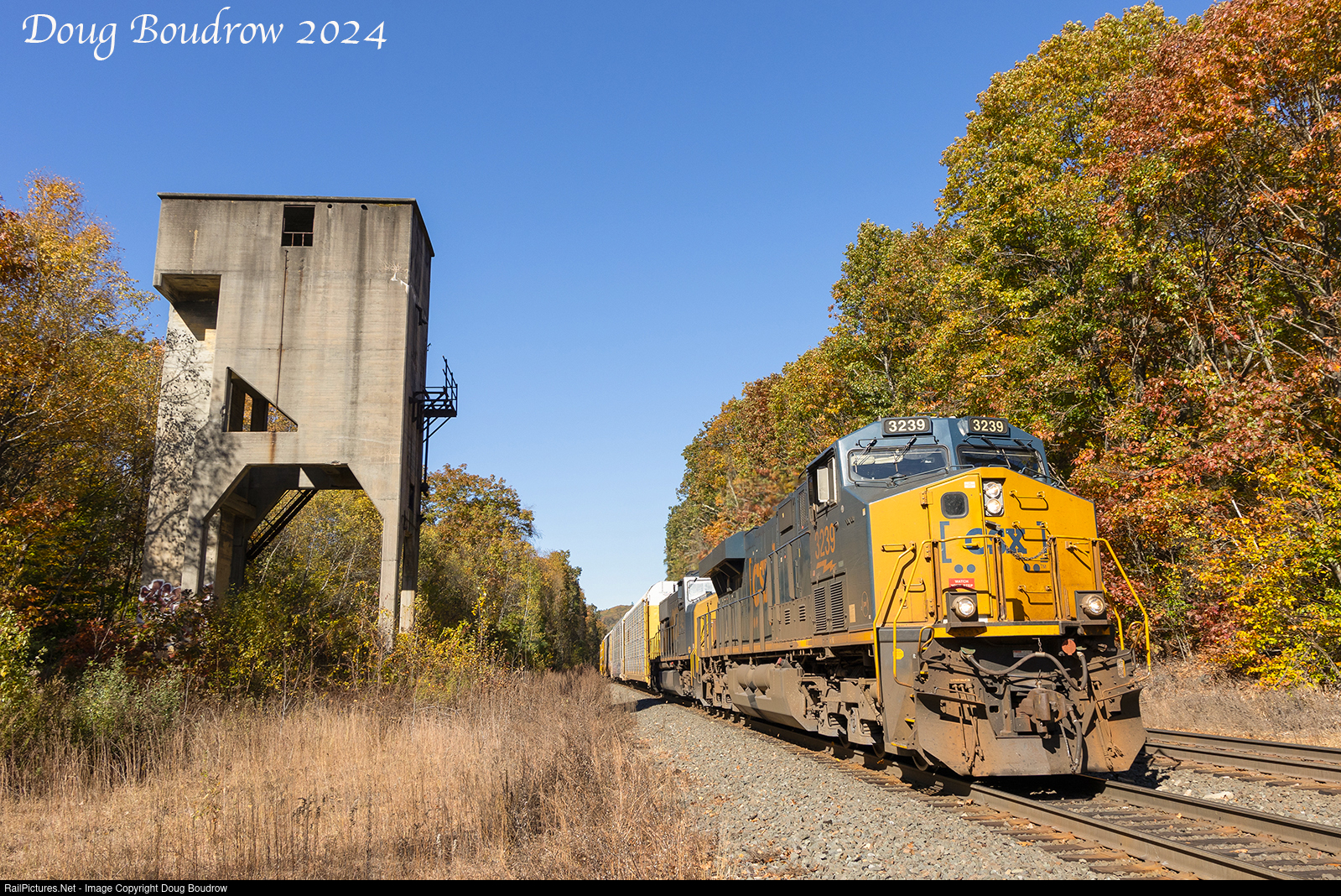 | CSX Buffalo, NY to East Brookfield, MA auto rack train M264 is seen passing the Boston & Albany coaling tower in Chester. |