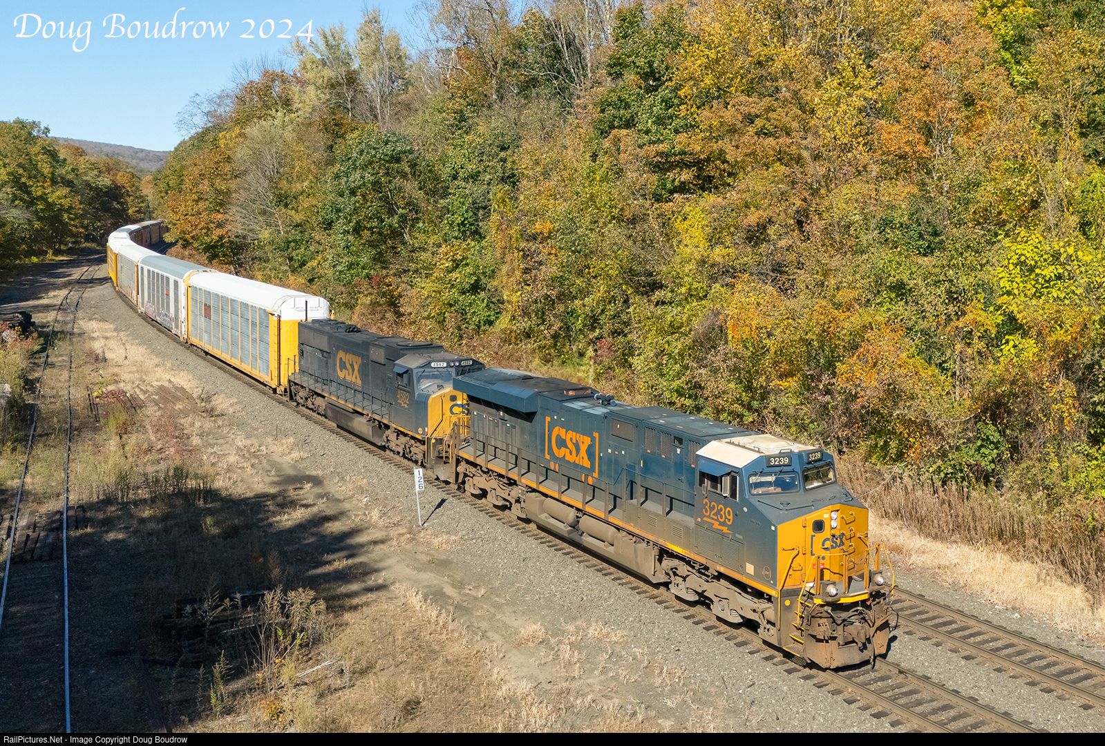 | CSX Buffalo, NY to East Brookfield, MA auto rack train M264 is seen passing Milepost 126 in Chester on a spectacular October afternoon. |