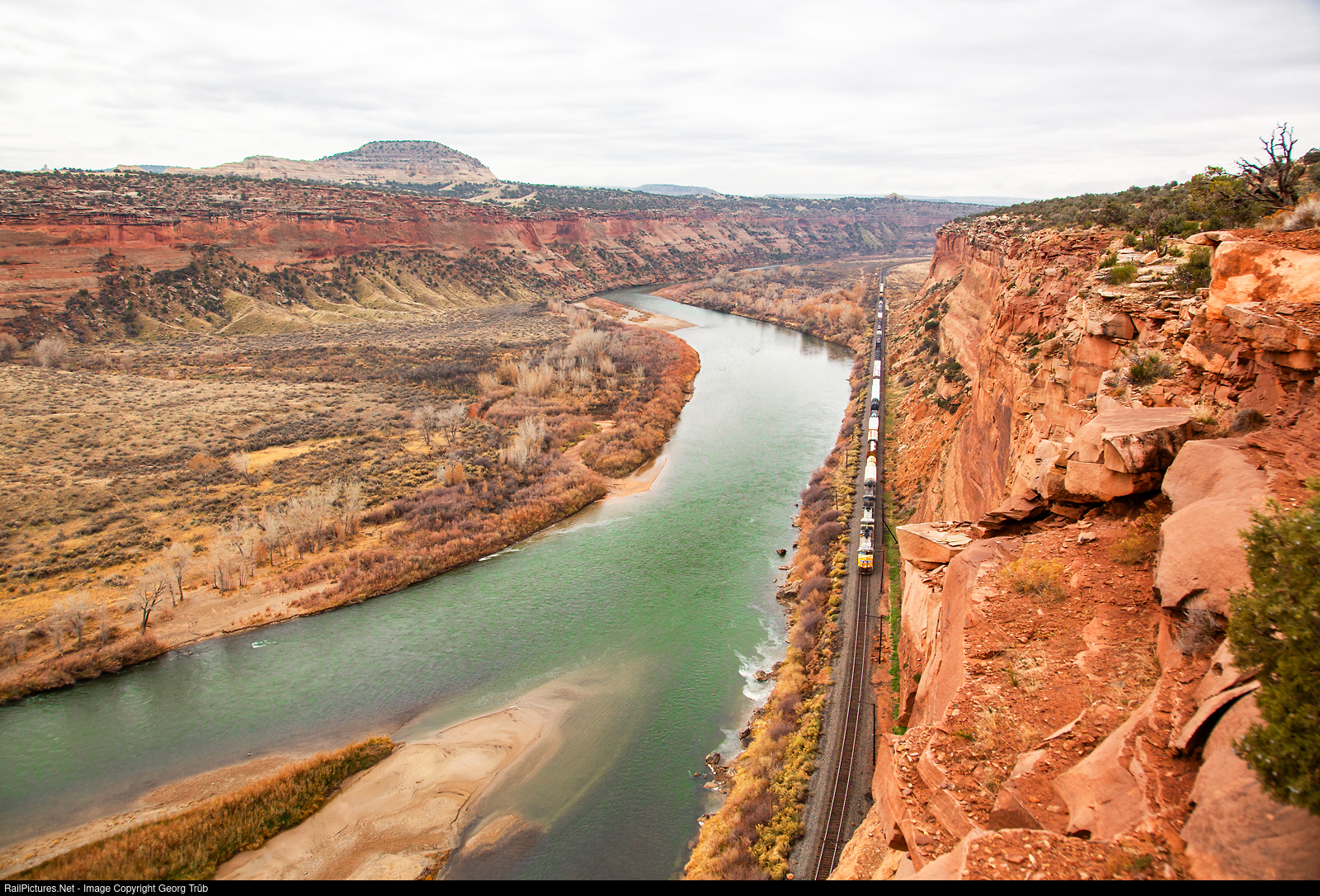 Spectacular view down in Ruby Canyon of the Colorado river from Knowles Canyon Overlook near Utaline, Co. A mixed UP freight with 3 GE locomotives in front and SD70ACe # 8336 shoving in the rear is following the river upstream towards Grand Junction.