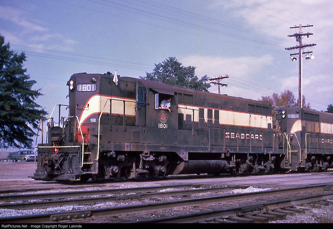 Seaboard GP7 1801 built 9/52 and rebuilt to a GP9M in March 1956 M.U.'d with GP9 1964 built 10/52. Photo taken at Raleigh, NC on October 29, 1966 eight months before the SAL+ACL merger in 1967. Photographer Louis A. Marre, from my collection.