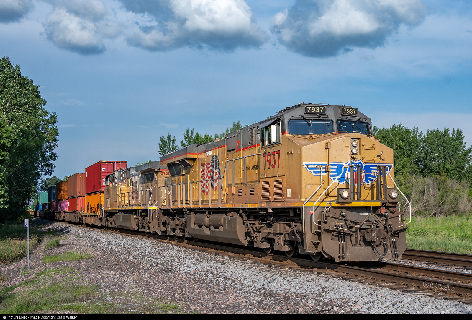 Heading from Joliet, Illinois’ Global 4 intermodal facility, Union Pacific train 2IG4SE-19 is heading to Argo Yard in Seattle, Washington. UP ES44AC 7937 and AC4400CW 5781 have this train well in hand as it crosses the flat Midwest. More power will likely be added in North Platte NE. (Marshalltown, Iowa – July 21, 2024)