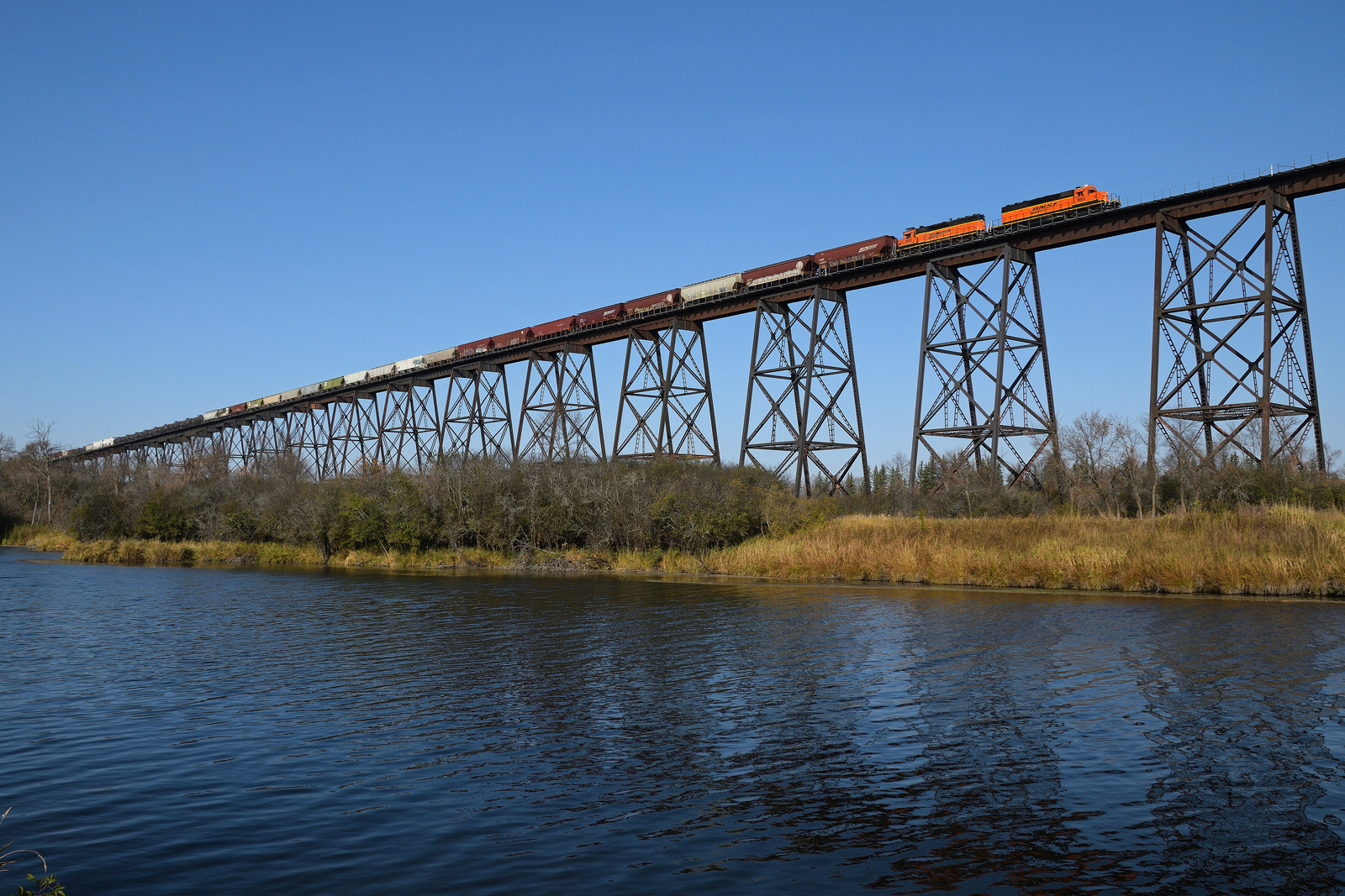 Having picked up some tank cars from the ethanol plant in Spiritwood and some covered hoppers from the elevator at Berea, the JY local does a good job of filling up the 3,860 foot length of the Hi-Line bridge at Valley City, ND. If you get a chance to go see this train on this bridge, I highly recommend it.