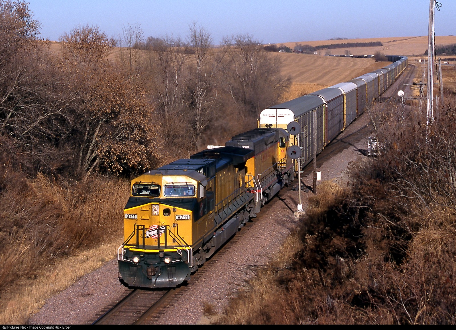 On formerly home rails, C&NW 8711 is paired with a repainted C&NW SD40-2 as they lead auto racks into the December sundown. This was C&NWs freight line between Missouri Valley, IA and Fremont, NE that bypassed Omaha and is still a main route for UP. Fuji Astia.