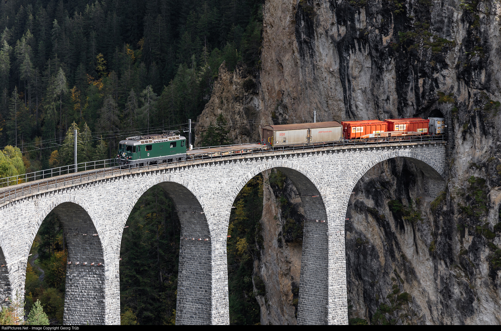 To cross the Landwasser river, which flows from Davos into the Albula at Filisur, the engineers chose the narrowest part of the valley when building the Albula Railway around 125 years ago. The 65-metre-high and 136-metre-long viaduct made of dark limestone lies in a curve with a radius of 100 meters and a gradient of 2.0 % and leads directly into the Landwasser tunnel. Built in just 1 1/2 years in 1901/1902, the imposing structure has been an UNESCO World Heritage Albula/Bernina site since 2008. The locomotive Ge 4/4 II # 611 "Landquart" of the Rhaetian Railway, pulling freight train 5152 from Samedan to Landquart, with 1700 kW and a maximum speed of 90 km/h was delivered on June 30, 1973 as the first of its series by SLM and BBC, was green with chrome lettering and had round lower lamps on the front. With the delivery of the second series of Ge 4/4 II from 1984/85, the locomotives of the first series also gradually received the new red livery. In 2004, locomotive # 611 was the first of the series to receive rectangular lower headlights with integrated tail lights. From 2007, it was the first of the series to wear an advertising livery for Login, which was changed several times but remained in place until 2024. Now, on the initiative of the "Green and Chrome" foundation, the locomotive was more or less restored to its original condition by the RhB workshop in Landquart and presented in Landquart on april 12th, 2024. The locomotive is still in daily use on the Rhaetian Railway's main network and is also equipped with dual brakes and the new ZSI-127 train protection system.