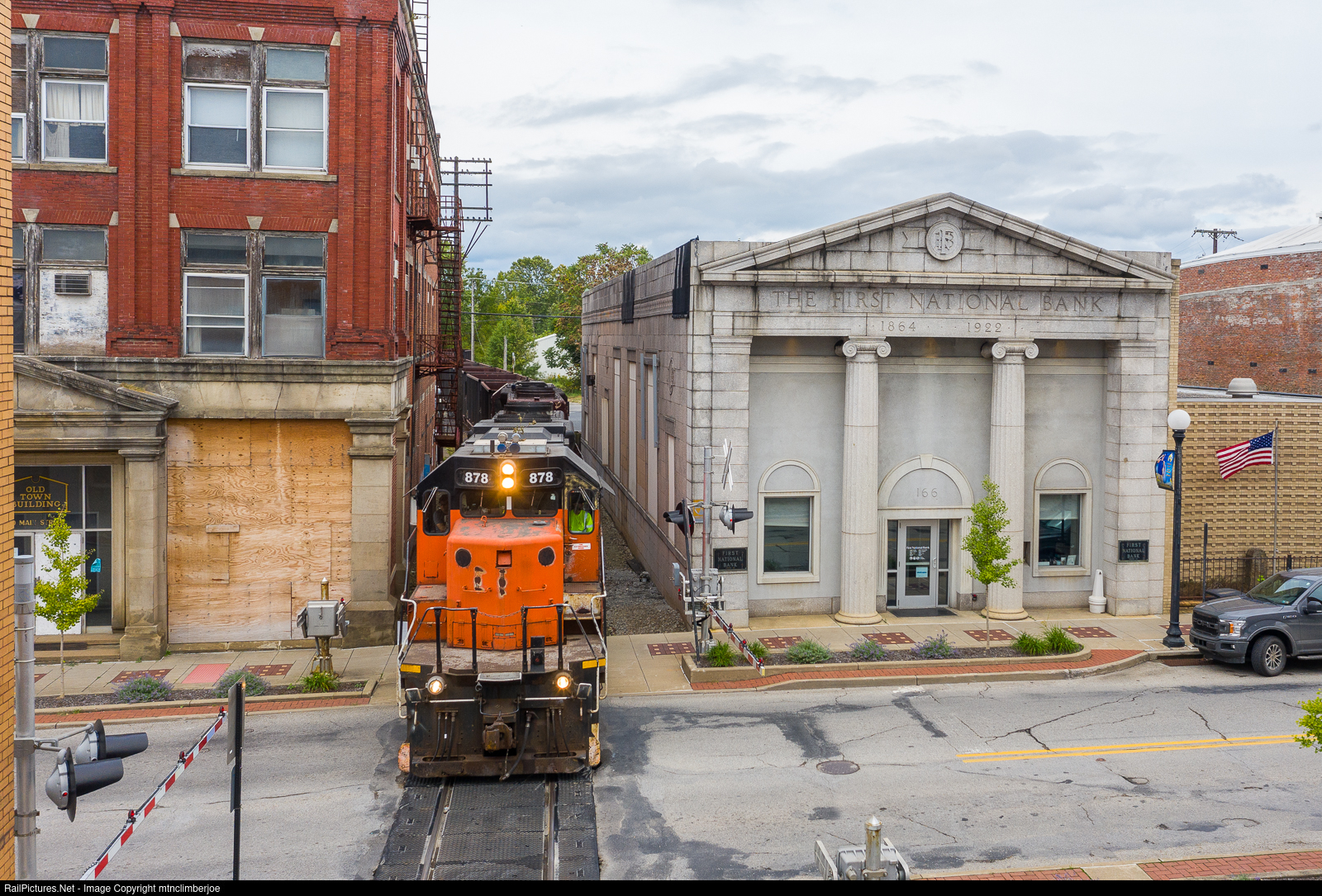 | Running through an alley and crossing Main Street in the heart of Greenville, Pennsylvania, the CN Greenville Subdivision passes between the Old Town Building and the First National Bank building. A pair of Bessemer SD38's are on the point of L523 as it rolls through this trackage with a string of empty ore hoppers in tow bound for the yard in Shenagno for air brake maintenance. |