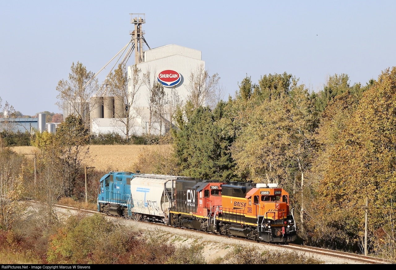 | CN 568 with long term leased BNSF GP39V 2968 trailing an interesting mixed lash up is seen heading back to Kitchener after dropping its train at Kellys and rearranging its consist after lifting a solo covered hopper at St. Marys. The Shur Gain facility in the distance is currently the busiest customer in town, even though the town was built around the cement industry.