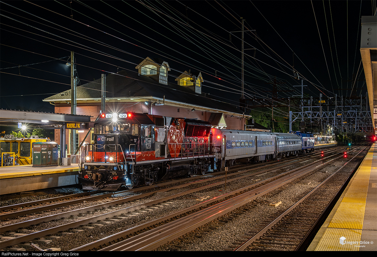 During the early morning hours of September 5th, 2024, The Metro North/ Department of Transportation Geometry Train, with CTDOT/CTrail Brookville BL20GHM 129 leading, prepares to head east from South Norwalk, Connecticut up the Danbury Branch. The train traversed all of Metro-North's mainline track while the the Federal Railroad Administration's (FRA) former Metroliner DOTX 216 inspection railcar, collects geometry data reports for the FRA and US Department of Transportation.