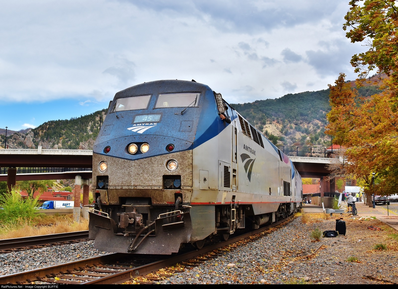 | A very dirty Amtrak engine #45 (P42DC) leads the California Zephyr out of the station at Glenwood Springs, Colorado