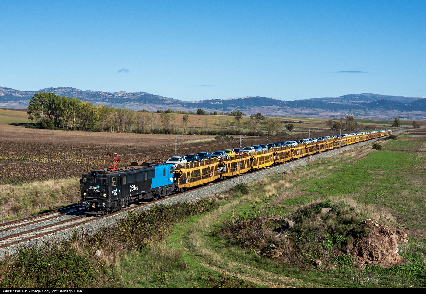 Freight with Volkswagen cars Pamplona-Muriedas at Briviesca. The locomotive is rented to Athos Rail company.