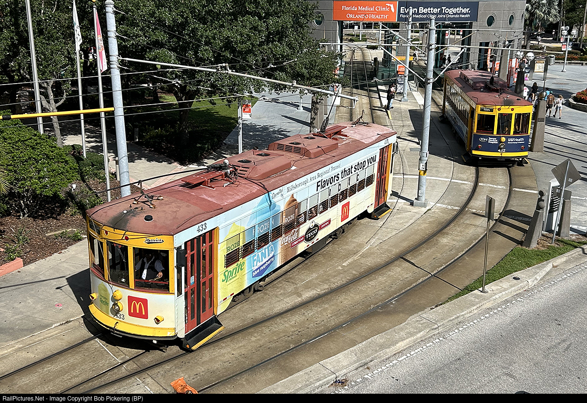 TECO Trolleys meet at Dick Greco station as 433 meets 432. Some streetcars as locally known carry wraps. Rides are currently free and the service is very popular.