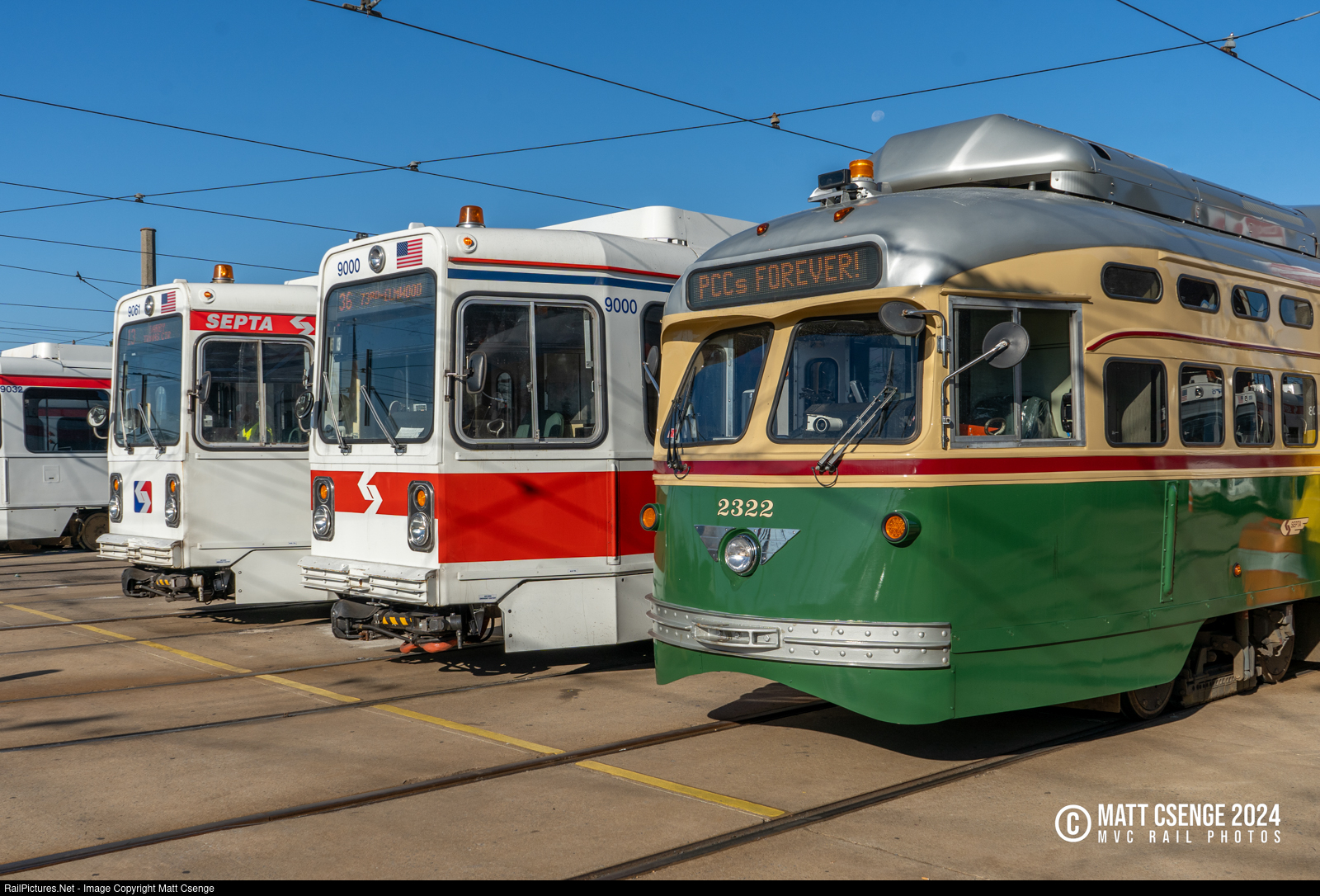 A trio of Southeastern Pennsylvania Transportation Authority (SEPTA) trolleys are seen lined up at the agency's Elmwood Depot, including Type K cars 9061 and 9000, the latter sporting a heritage as-delivered paint scheme, and PCC III car 2322. |