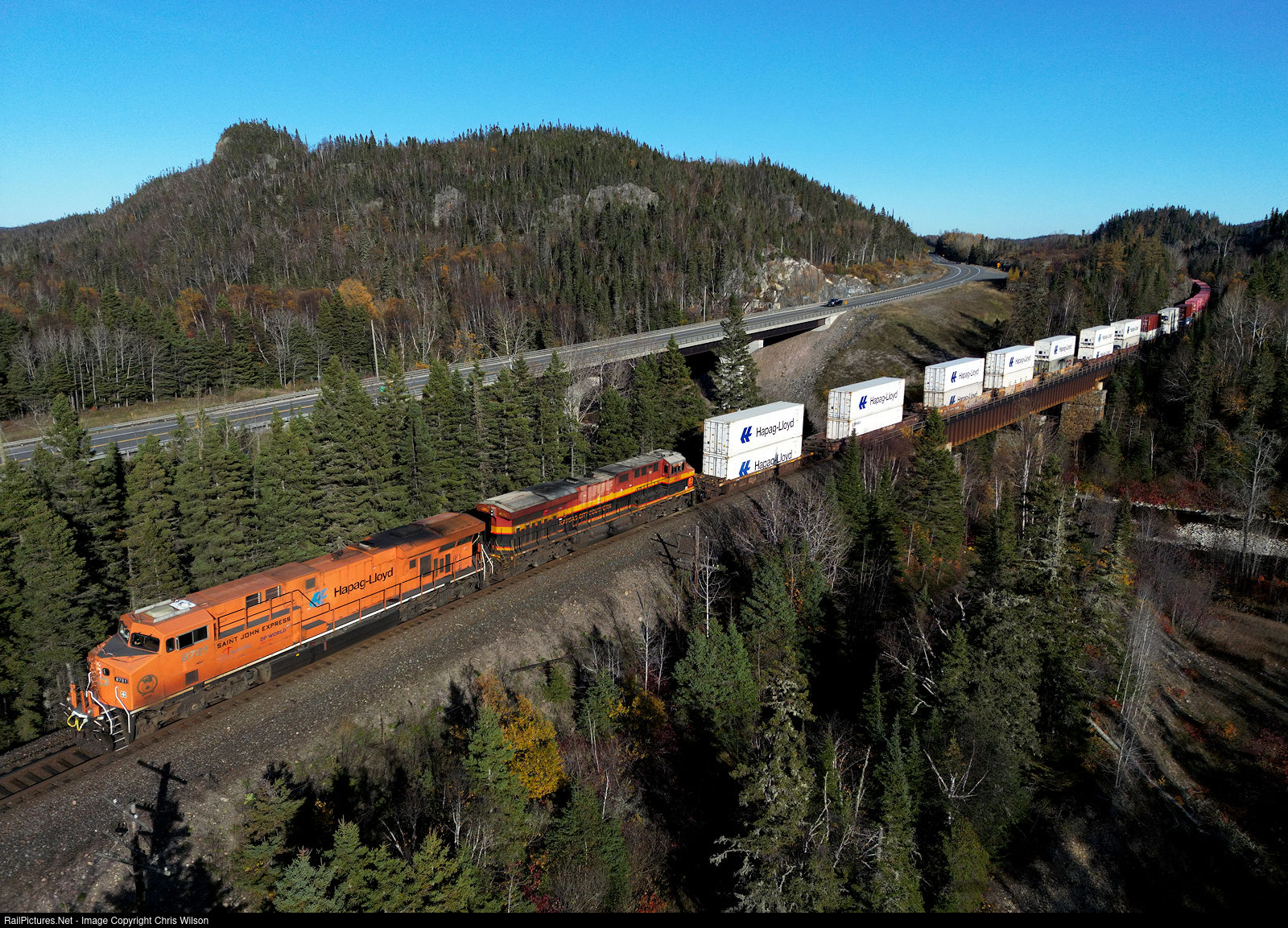 Montreal to Vancouver train 113 heads across the Steel River bridge with CPKC's Hapag Lloyd/Port of Saint John locomotive on the point.