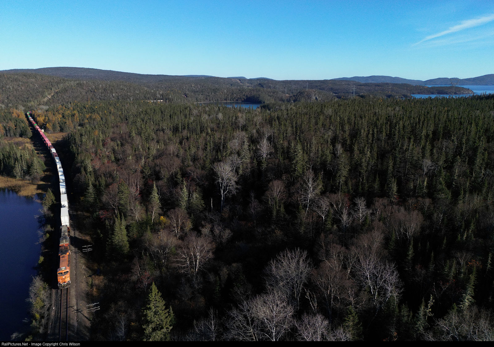 CPKC 113-19 eases along west of Middleton snaking along one of the many bays of Lake Superior passing Ripple Lake.