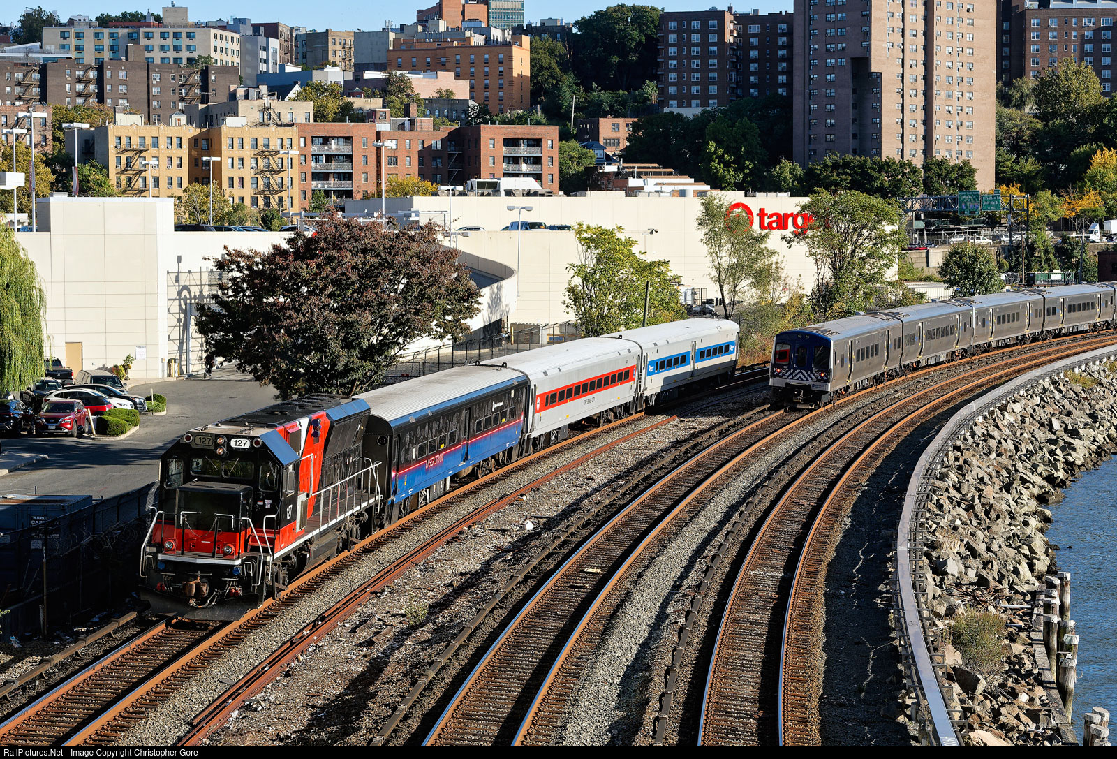 Metro-North's LaserTrain passing through the Marble Hill section of Manhattan. The LaserTrain is used to clean the rails of leaf residue.