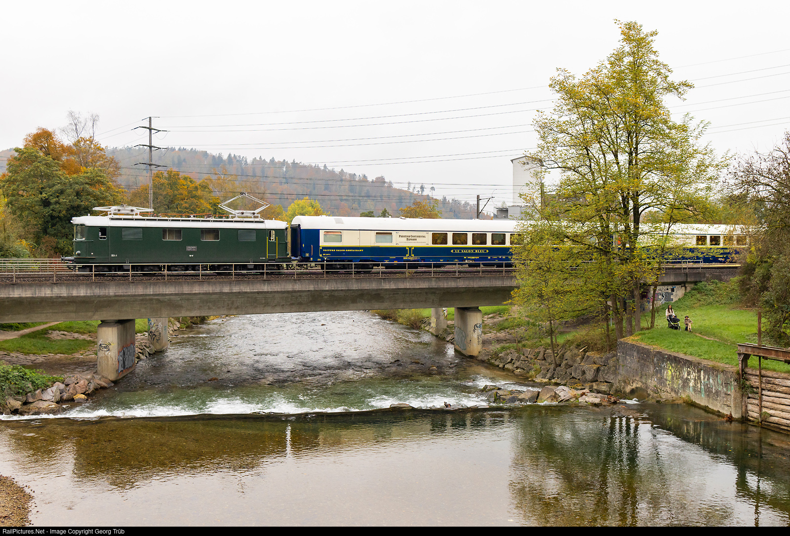 | The PRESTIGE CONTINENTAL EXPRESS of the TR TransRail, pulled by privately owned former SBB Re 4/4 I # 10039, is crossing the Töss river near Winterthur with a RailEvent autumn journey with dishes of wild game, via Wallisellen-Zürich track 31-Brugg-Olten-Solothurn-Biel-Moutier-Delémont-Basel-Brugg-Zürich track 33-Oerlikon-Wallisellen back to Winterthur.