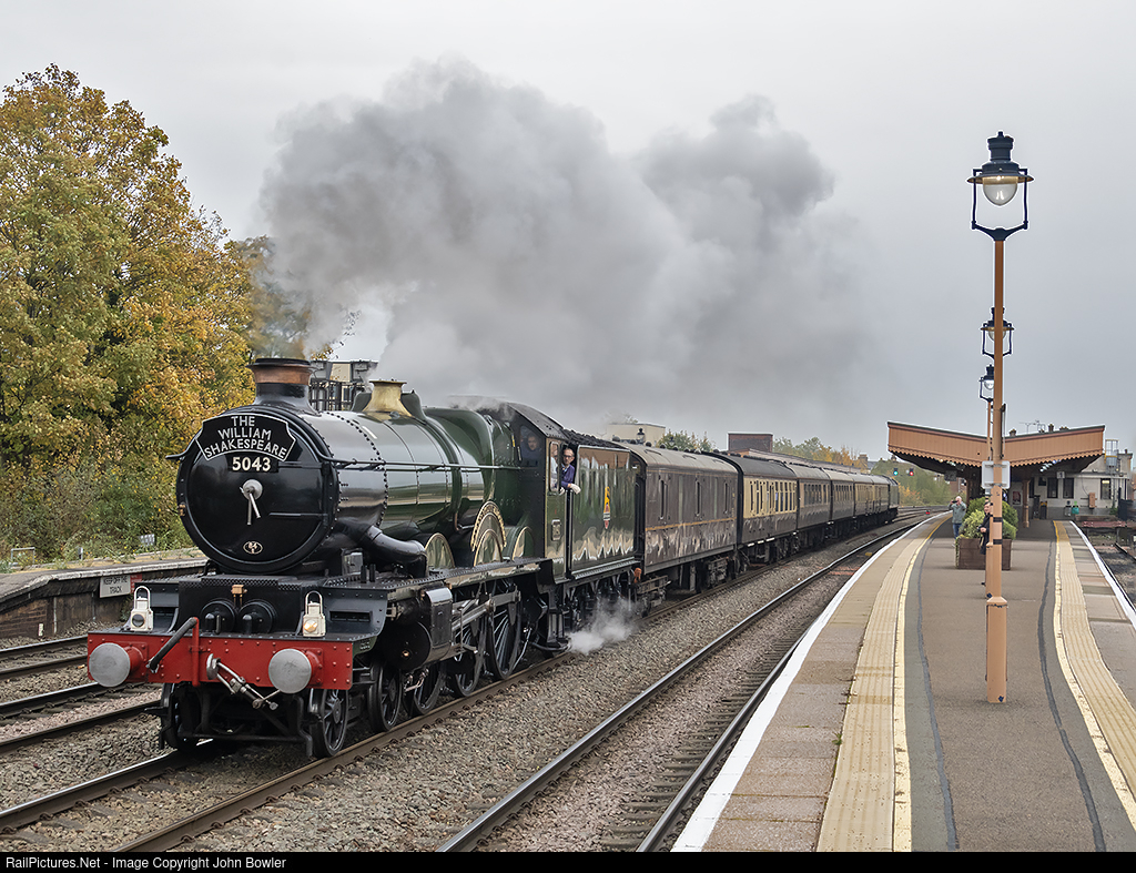 | Badly let down by the UK weather again today but it's always a treat to see GWR 5043 'Earl of Mount Edgcumbe' this time at the head of the 1Z43 'The William Shakespeare' 1220 Didcot Parkway - Stratford-upon-Avon private charter as it accelerates through Leamington Spa Station in preparation for the accent of Hatton Bank with Class 47 47773 on the rear. |