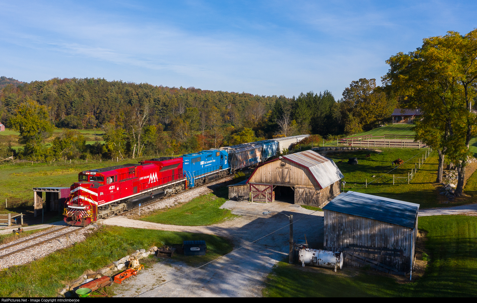 | With SD70M-2 431 in the lead, the Vermont Railway's RDHJ job makes its way south on the B&R Subdivision as it heads towards Hoosick Junction to interchange with the Berkshire & Eastern. As the train approaches Wallingford, Vermont it passes by the barns of the Otter Creek Ranch where the animals don't seem to pay much attention to the break in the morning silence. |