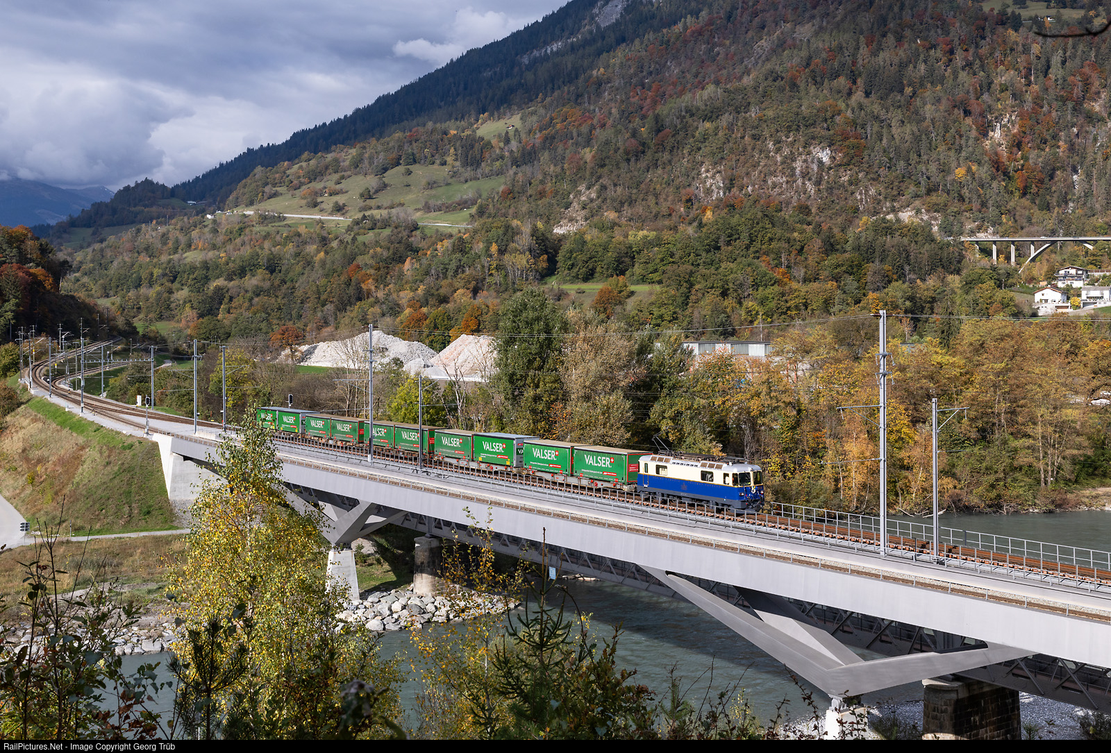 | Ge 4/4 II # 626 "Malans" in the new "Pullman" livery cobalt blue/ivory is pulling the freight train 5732 from Ilanz to Untervaz-Landquart over the Hinterrhein bridge at Reichenau-Tamins. The train is transporting VALSER mineal water in swap bodies loaded on fouraxle flat cars. |