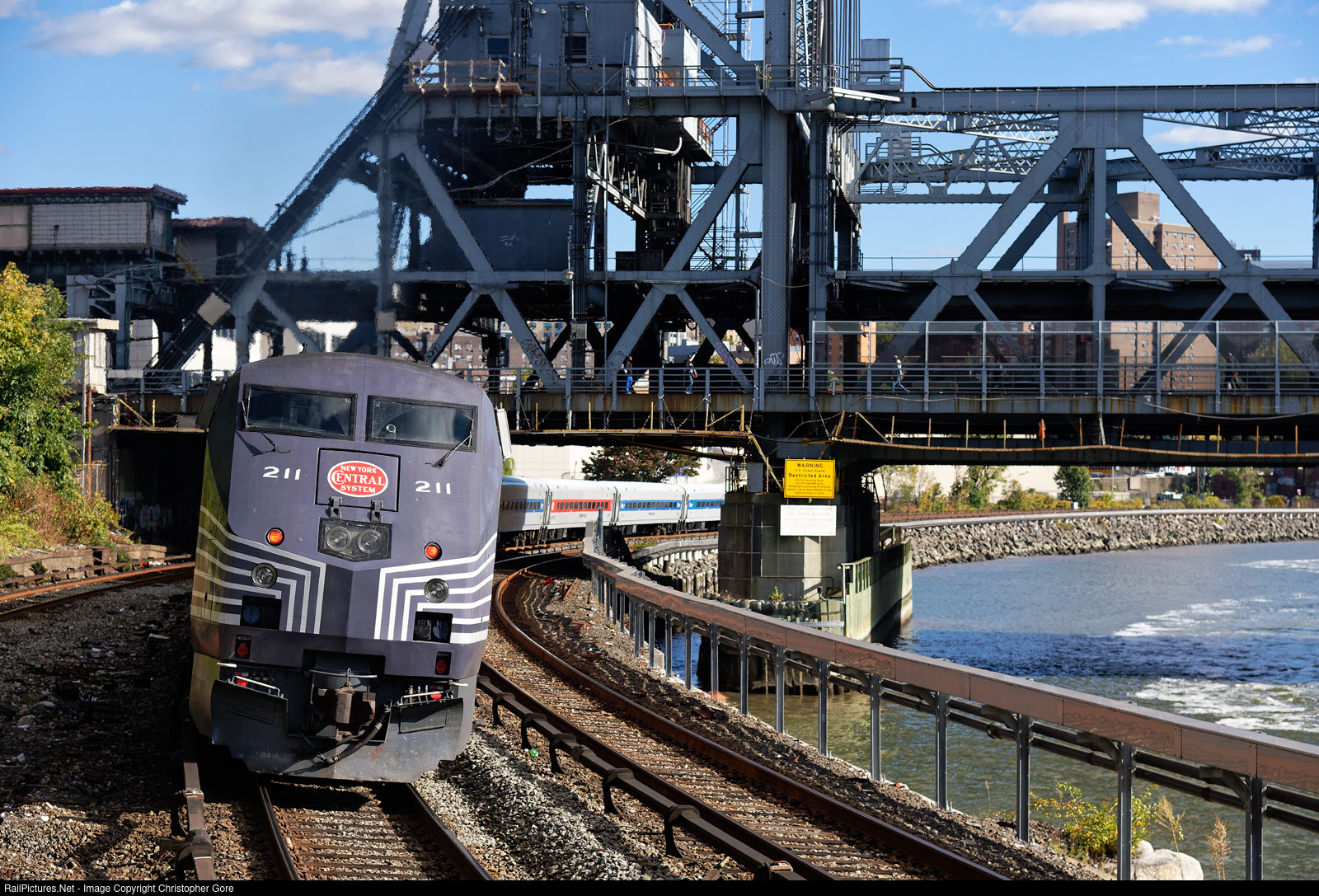 | Metro-North's New York Central heritage P32AC-DM 211, pushing train 866, under the Broadway bridge in the Marble Hill section of Manhattan. |