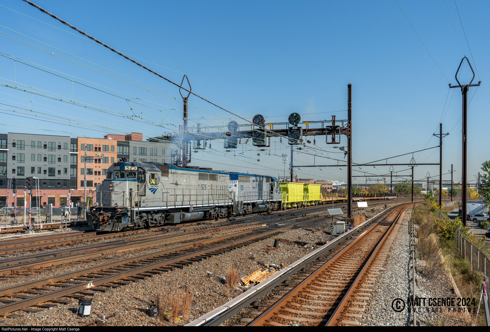 Amtrak GP38H-3 no. 523 (EMD, 1966-68) and GP38-3 no. 723 (EMD, 1976) are seen leading train KN720 under the position color lights at the east end of Dock Interlocking as they head west with six maintenance cars from Hudson Yard. The lead unit was originally a GP40TC built for GO Transit by GMD, which was rebuilt into its current form by Norfolk Southern Railway in 2005. |