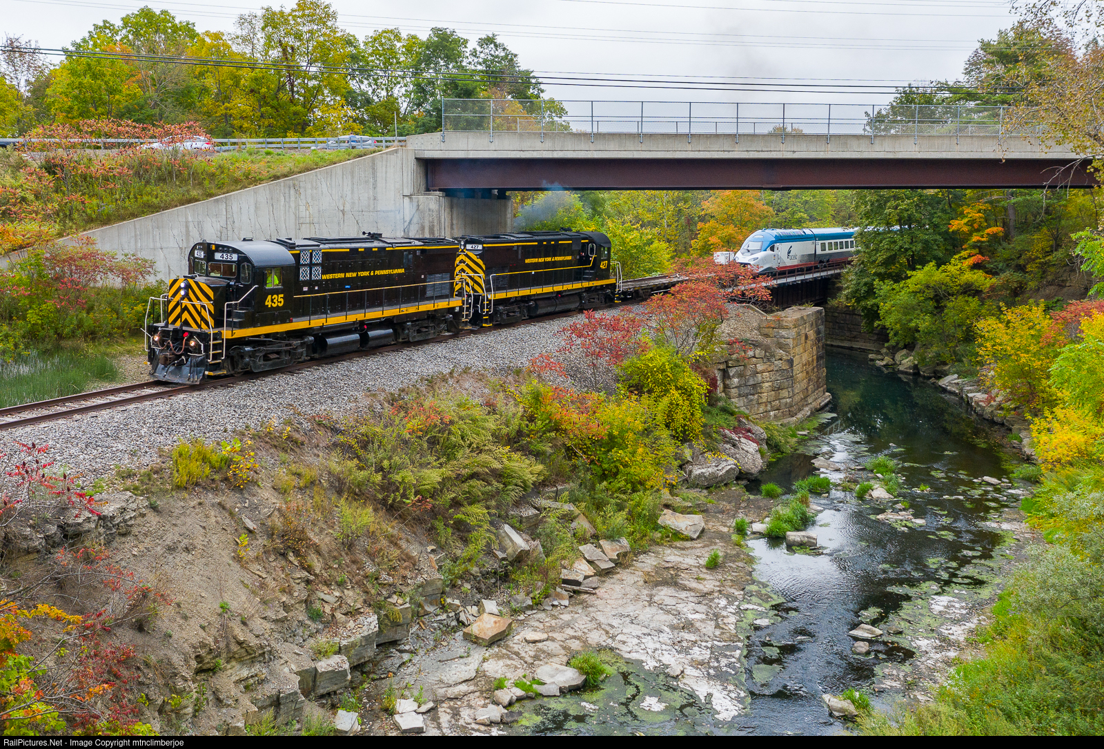 | A pair of WNYP Alcos lead a special move with one of Amtrak's Avelia trainsets in tow rounds the bend north of Belmont, New York as they cross over Van Campen Creek and underneath Transit Hill Road. This is one of several trainsets from the Alstom Facility in Hornell bound for storage at the yard in Olean. |