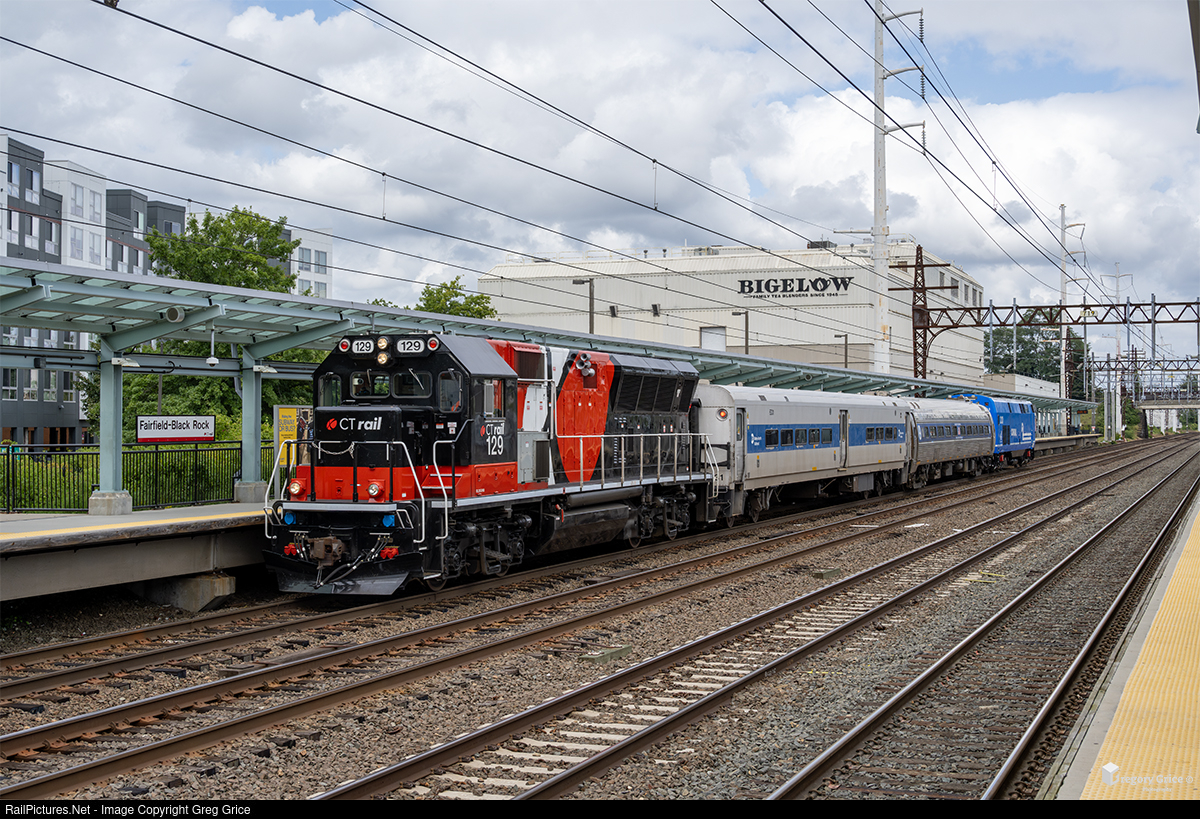 During the afternoon of September 6th, 2024, The Metro North/ Department of Transportation Geometry Train, with CTDOT/CTrail Brookville BL20GHM 129 leading, passes by the recently renamed Fairfield-Black Rock station in Fairfield, Connecticut while heading west down the New Haven Line towards Stamford Yard. The train traversed all of Metro-North's mainline track while the Federal Railroad Administration's (FRA) former Metroliner DOTX 216 inspection railcar, collected geometry data reports for the FRA and US Department of Transportation.