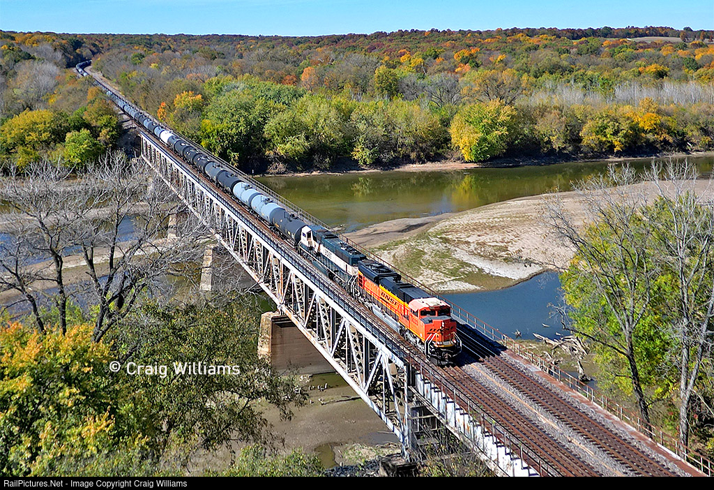 | Much to the surprise of us, this tank train out of Williams, OK, had some coal train power on it. It's kind of rare for these parts on the Transcon. The train crosses the Des Moines River on the Marceline Sub and from Missouri to Iowa. I'm not sure what was in the tanks or if it was loaded or empty.